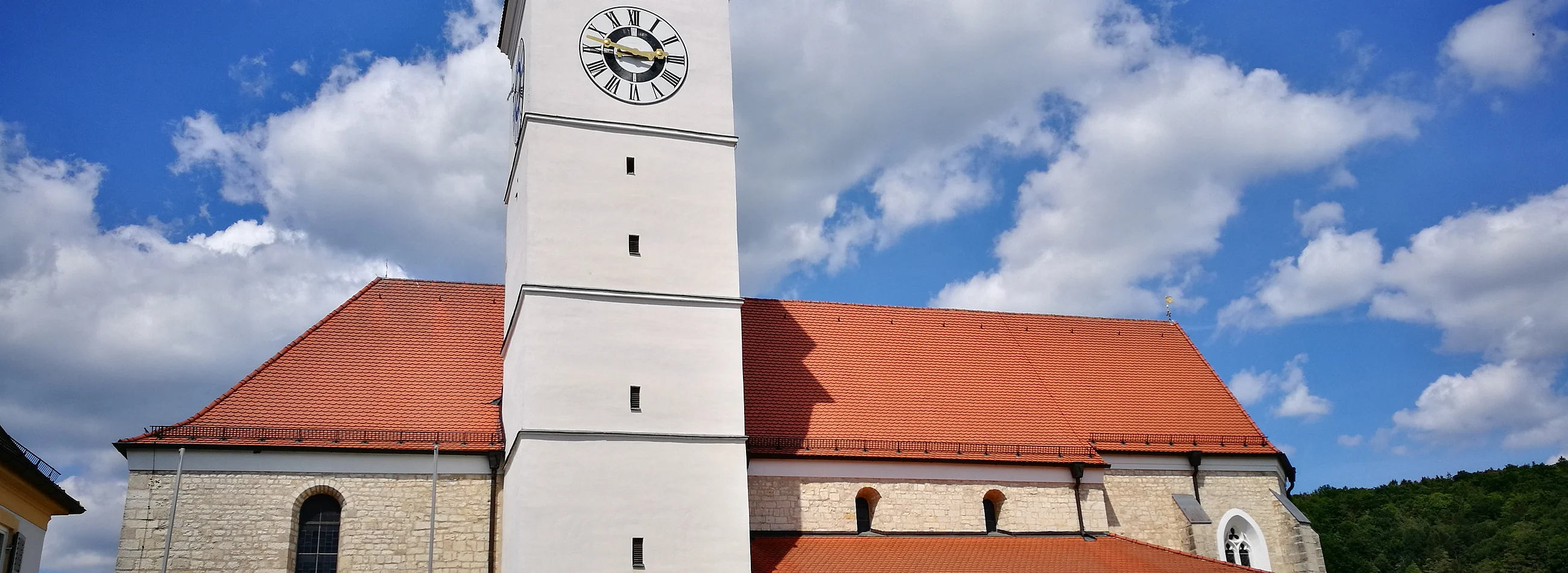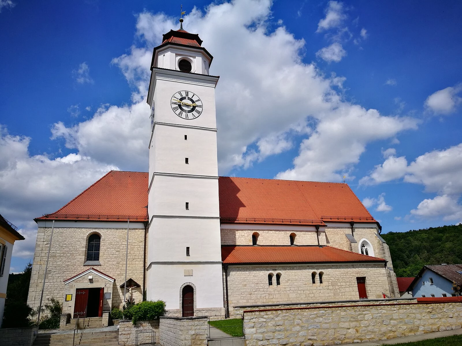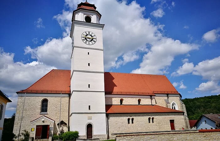 Das Langhaus der Kirche ist im Kern romanisch (Weihe 1063), der Chor entstand in der Gotik (um 1300), ebenso wohl der Turm, der nach einem Brand 1728 nach den Plänen von Gabriel de Gabrieli einen barocken Helm erhielt. Gabrieli erbaute auch den Pfarrhof neben der Kirche (1744). Das Langhaus wurde 1842 nach Westen und 1931/32 um die Seitenschiffe erweitert.