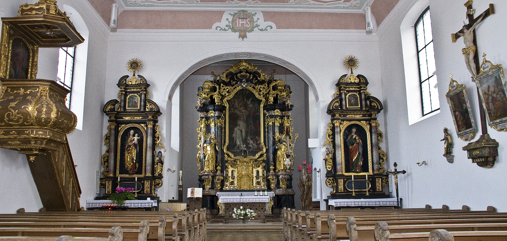 Er wurde 1804 aus dem sog. Kaisheimer Haus in Ingolstadt, einer Niederlassung der Zisterzienserabtei Kaisheim bei Donauwörth, erworben. Der 1756 geweihte Altar dürfte von dem Ingolstädter Schreiner Johann Michael Zängl gefertigt worden sein. Das Altarblatt, das die Erscheinung Mariens vor dem hl. Bernhard v. Clairvaux, dem größten Heiligen des Zisterzienserordens, zeigt, ist vom Ingolstädter Maler Johann Evangelist Hölzl signiert (1755). Die großartigen Altarseitenfiguren des hl. Bernhard (links) und des hl. Benedikt (rechts) sind wohl dem Dillinger Meister Johann Michael Fischer zuzuschreiben. Spätrokokoschöpfungen (um 1794) sind die Kanzel, die geschnitzten Stuhlwangen und die durchbrochen gearbeitete Balustrade der ehemaligen Kommunionbank, die 1974 für den Volksaltar und den Ambo verwendet wurde.