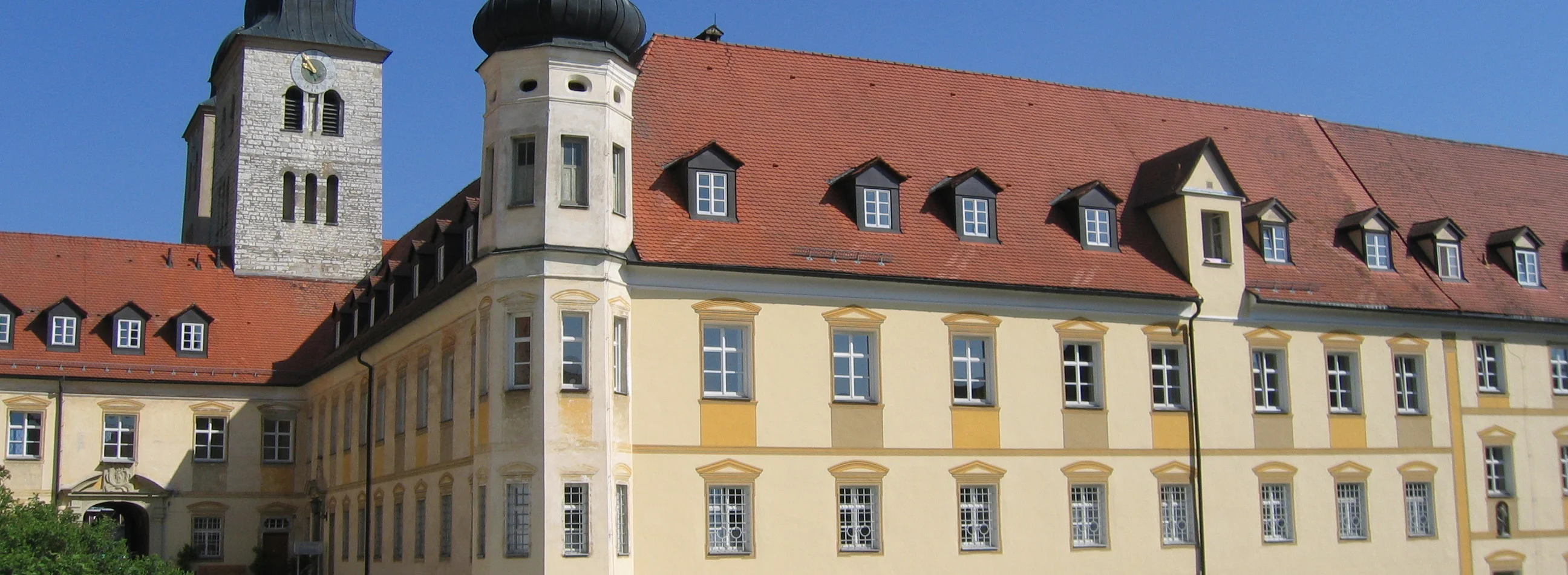 Beim Wiederaufbau waren Fürstbischof Marquard Schenk von Castell und österreichische Stifte behilflich. Das Grundschema der mittelalterlichen Anlage wurde beibehalten. Obwohl bislang keine Belege für eine Autorschaft durch Jakob Engel bekannt geworden sind, sind die stilistischen Merkmale so eindeutig, dass von Seiten der Forschung daran nicht gezweifelt wird. Unter Abt Romanus Dettinger (1694-1703) wurde die alte Wohnung des Abtes abgebrochen und 1696 durch eine größere repräsentative Prälatur, die im Westen der Kirche liegt, ersetzt. Ein stuckierter Saal zeigt sein Wappen und Allegorien der Kardinaltugenden. Der Gästebau, eine Zweiflügelanlage, die den westlichen Innenhof ausbildet, wurde 1699 aufgeführt. Er ist durch ein für Engel typisches Ecktürmchen und durch ein Portal mit Lisenengliederung und Sprenggiebel charakterisiert. Die Fassade ist illusionistisch bemalt und zeigt dieselbe, für Engel typische Fenstergestaltung wie beim Schloß in Greding. Der Trakt, der im 20. Jahrhundert für schulische Zwecke genutzt worden ist, enthält einen Festsaal mit Stuckdecke, die aus Akanthusranken und symbolischen Darstellungen der vier Jahreszeiten besteht. Einige der aufwendigen barocken Türumrahmungen haben sich erhalten.