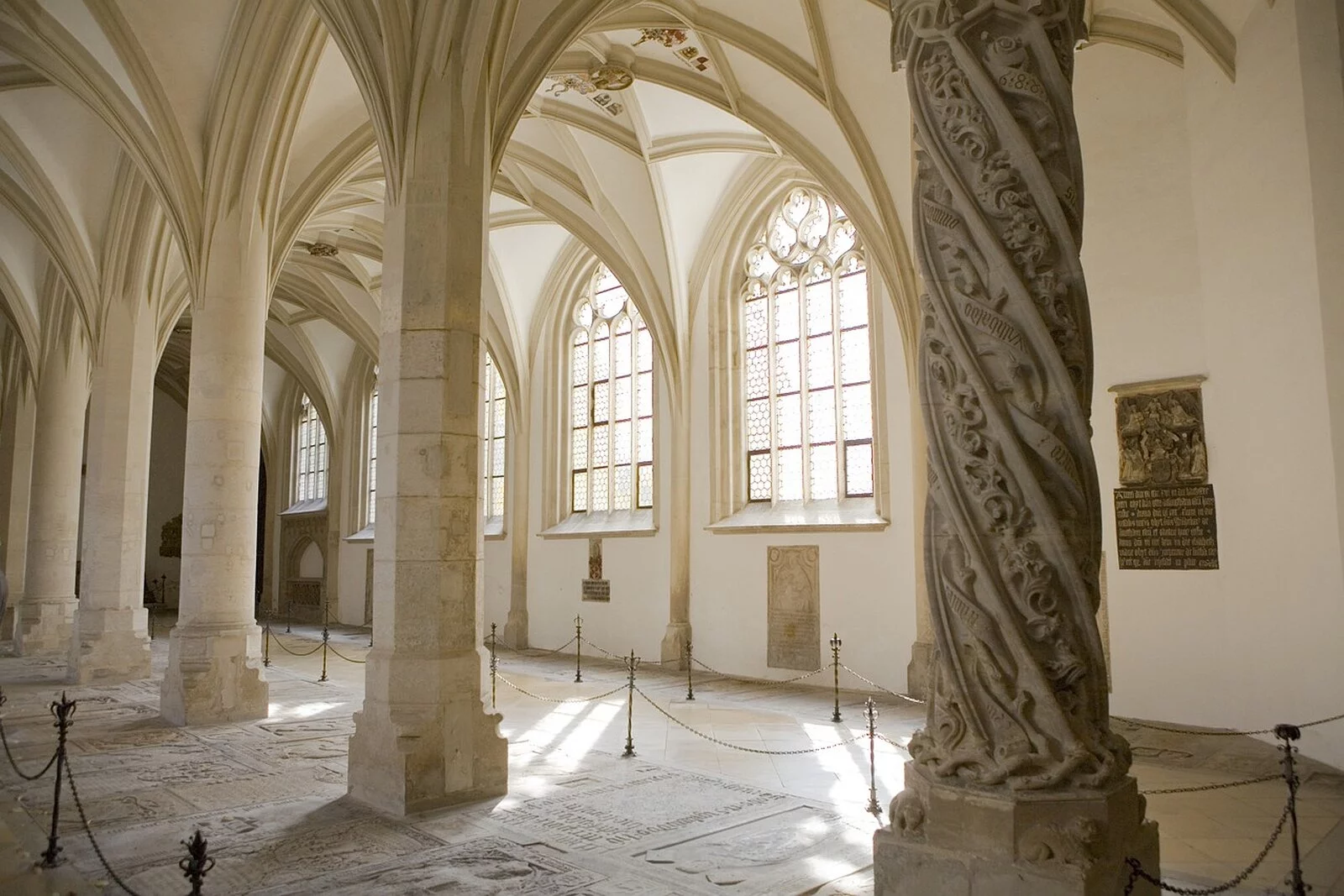 Das Mortuarium zählt zu den schönsten und stimmungsvollsten Raumschöpfungen der spätgotischen Architektur Südbayerns. Die zweischiffige Halle diente bis zur Säkularisation als Grablege der Domkapitulare. Dieser halbsakrale Raum, der den westlichen der vier Flügel des Kreuzgangs bildet, wurde 1498 eingeweiht. Der Raum wirkt ausgewogen und feierlich, die Epitaphien an den Wänden erzählen jahrhundertelange Geschichte: Adelsgeschichte, Kirchengeschichte, Glaubensgeschichte. Eine Pfeilerreihe mit Stützenwechsel gliedert den ideal proportionierten Raum. Besonders prächtig gestaltete Stützen markieren Anfang und Ende des Raums und verweisen auf das Thema Leben und Tod. Das kostbarste Kunstwerk des Mortuariums ist das sog. Holbeinfenster, das bunte Glasfenster an der Längsseite des Saals. Sie entstanden um 1500, stilgeschichtlich an der Wende der Spätgotik zur Renaissance, und wurden von dem Augsburger Künstler Hans Holbein d. Ä. geschaffen. Der Titel des Bildes wurde passend zum Thema des Ortes gewählt: "Das jüngste Gericht". In beeindruckenden Farben und dramatischen Szenen wird gezeigt wie sich die Vertreter aller weltlichen und geistlichen Stände trennen und ins Paradies oder den Höllenschlund eintreten. Eine Kreuzigungsgruppe des Eichstätter Künstlers Loy Hering (1521) an der Südwand zählt zu dem wertvollen Bildschmuck des Mortuariums.