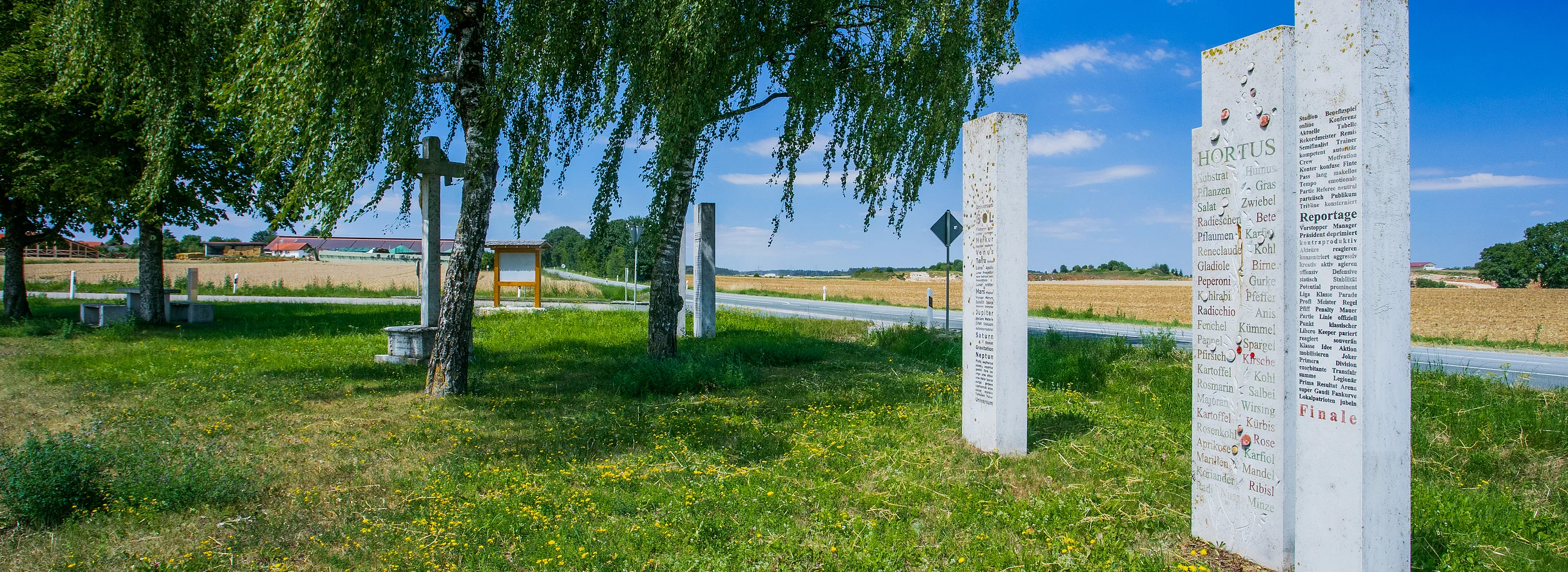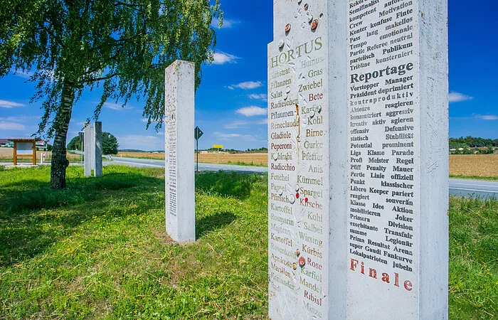 Die römische Präsenz in unserem Land ist heute noch zweifach zu spüren. Einerseits prägt der Limes das Landschaftsbild in der Region, andererseits ist der Einfluss der lateinischen Sprache im Deutschen deutlich erkennbar. Diesen Einfluss thematisiert das Kunstwerk „No Limit“ hier in Petersbuch.