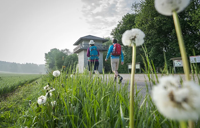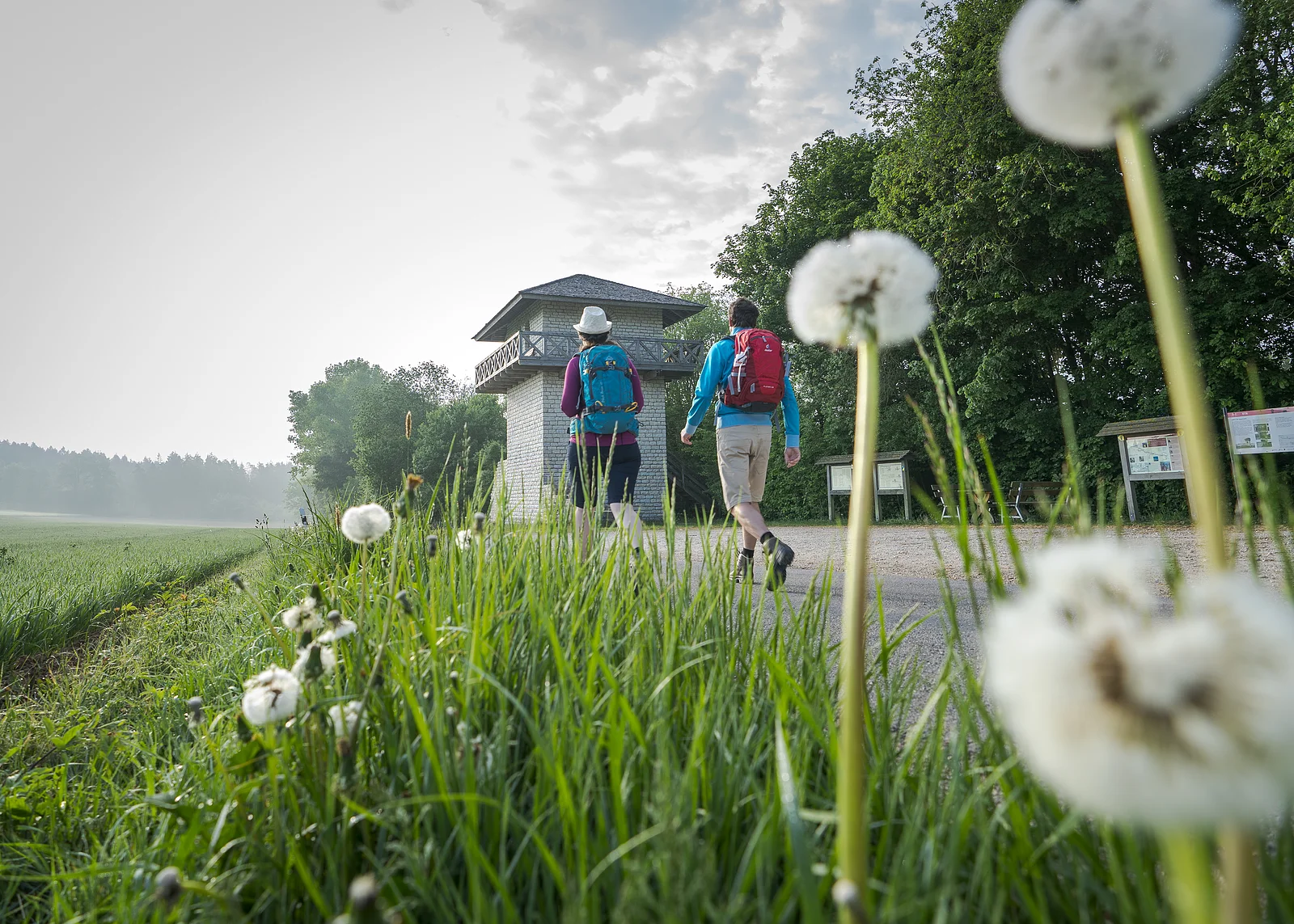 Der dreigeschossige Bau aus handbehauenen Kalkbruchsteinen wurde 1992 fertiggestellt. Der Turm hat einen Zugang im ersten Obergeschoss, eine betretbare umlaufende Holzgalerie im zweiten Obergeschoss und ein Zeltdach aus Holzschindeln. Grundlage für die Wiedererrichtung waren die Grundrisse der weiter östlich aufgefundenen Steintürme. Aus der Tatsache, dass dort im Erdgeschoss keine Eingangstüre entdeckt wurde, schließt man, dass der Zugang über eine (einziehbare) Leiter im ersten Obergeschoss erfolgte.