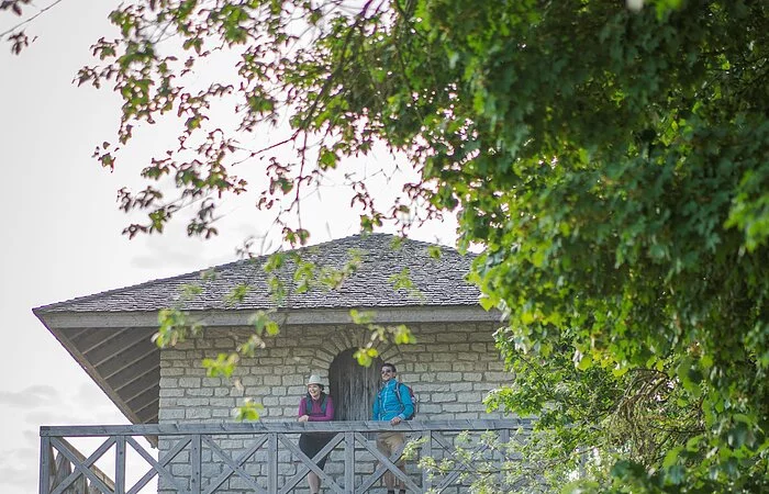Zwei Wanderer, eine Frau und ein Mann, laufen auf den Limesturm zu. Beide haben einen Rucksack dabei. Im Vordergrund sind einige Pusteblumen im Gras zu sehen. Der Himmel ist bewölkt.