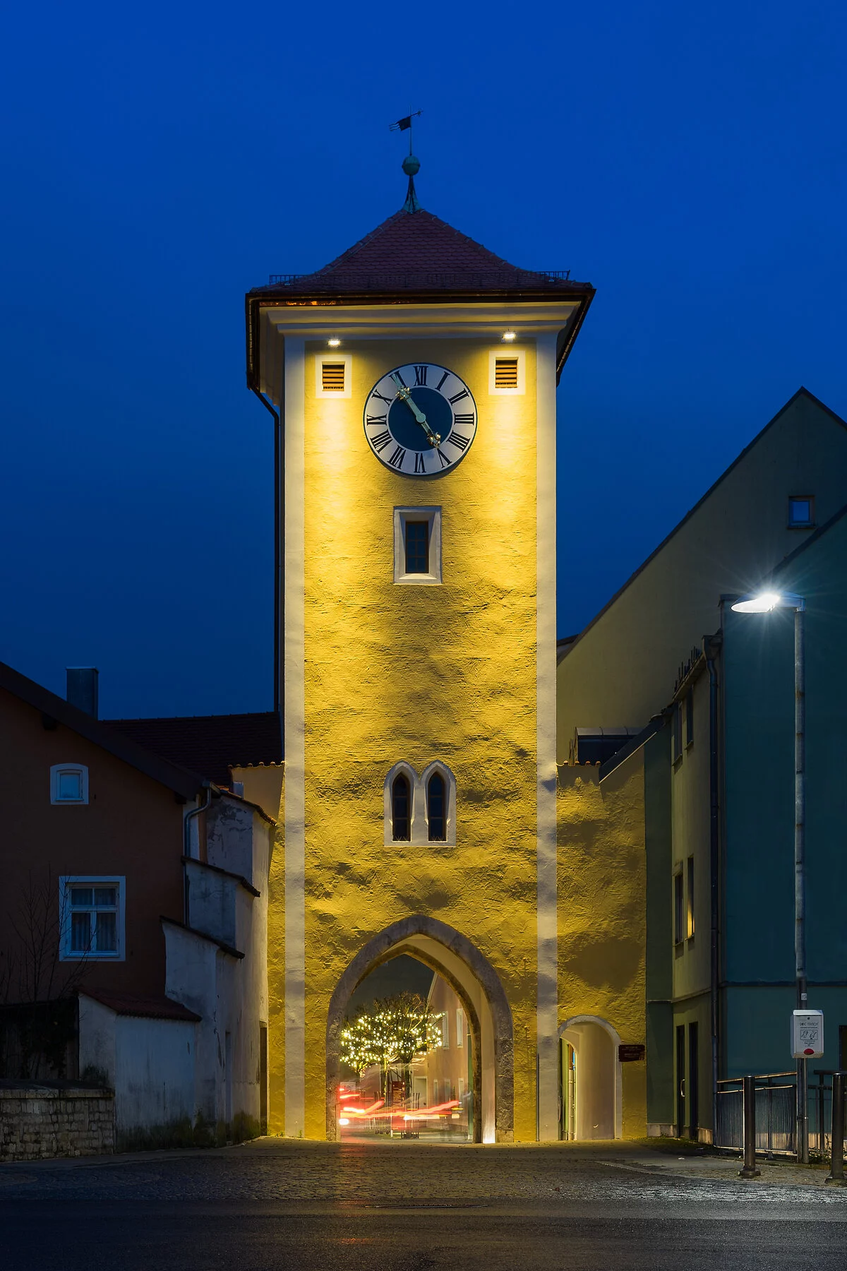 Durch das Mittertor führt der Rundgang wieder in die Altstadt. Der im 14. Jh. erbaute Wehrturm trug ursprünglich ein Satteldach. An der Außenseite befand sich bis 1869 ein Vorhaus. An der Innenseite des Stadttores wurde 1904 ein Wandbild angebracht, das die Gefangennahme der österreichischen Besatzung durch Metzgermeister Kraus am 12. Dezember 1705 darstellt. Das Original des Gemäldes befindet sich im Nationalmuseum in München.