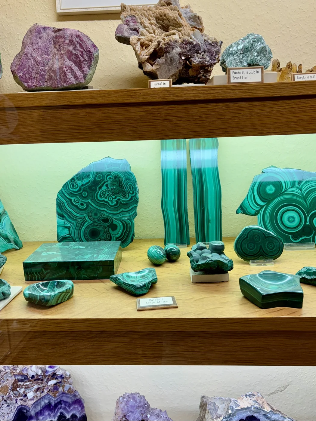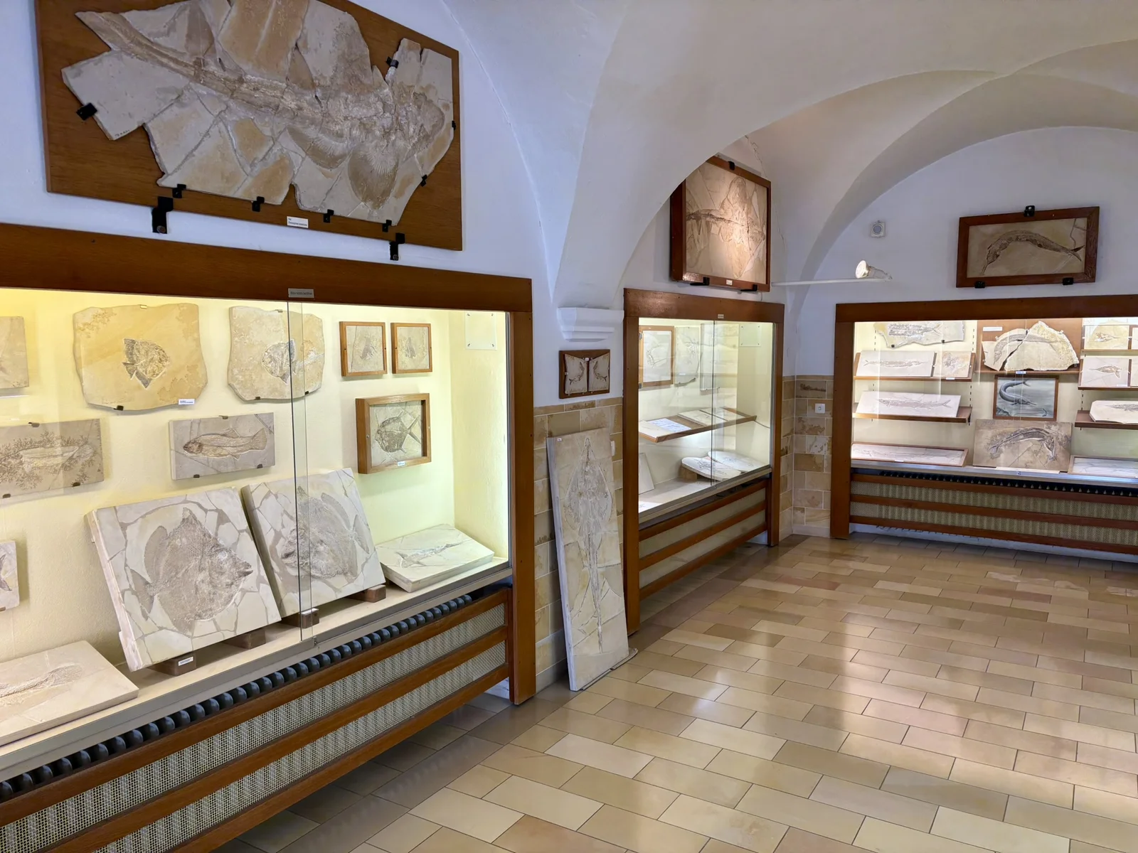 Im Mittelgang des Museums stehen links und rechts beleuchtete Vitrinen. Zwei Wanderer betrachten eine Vitrine auf der linken Seite. Der Raum ist hell und hat zudem Säulen und Rundbögen.in einer Vitrinen sind Edelsteine verschiedener Farben zu sehenDer Ausstellungsraum des Msueums mit Vitrinen an den Wänden, in denen die Fossilien des Jura-Meeres ausgestellt sind.An der Wand hängt ein Fossil eines Art Rochen