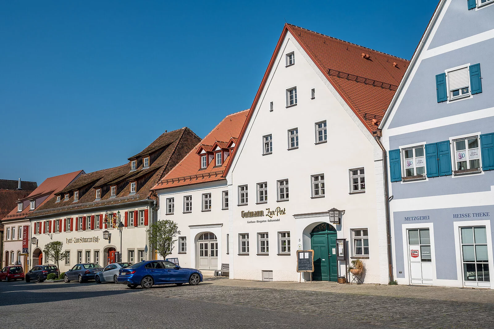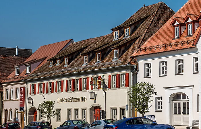 Das aufwendig sanierte Vorderhaus entstand im 19.Jh. als damals einziges traufseitig zur Straße stehendes Gebäude. Heute wird es als Hotel genutzt.