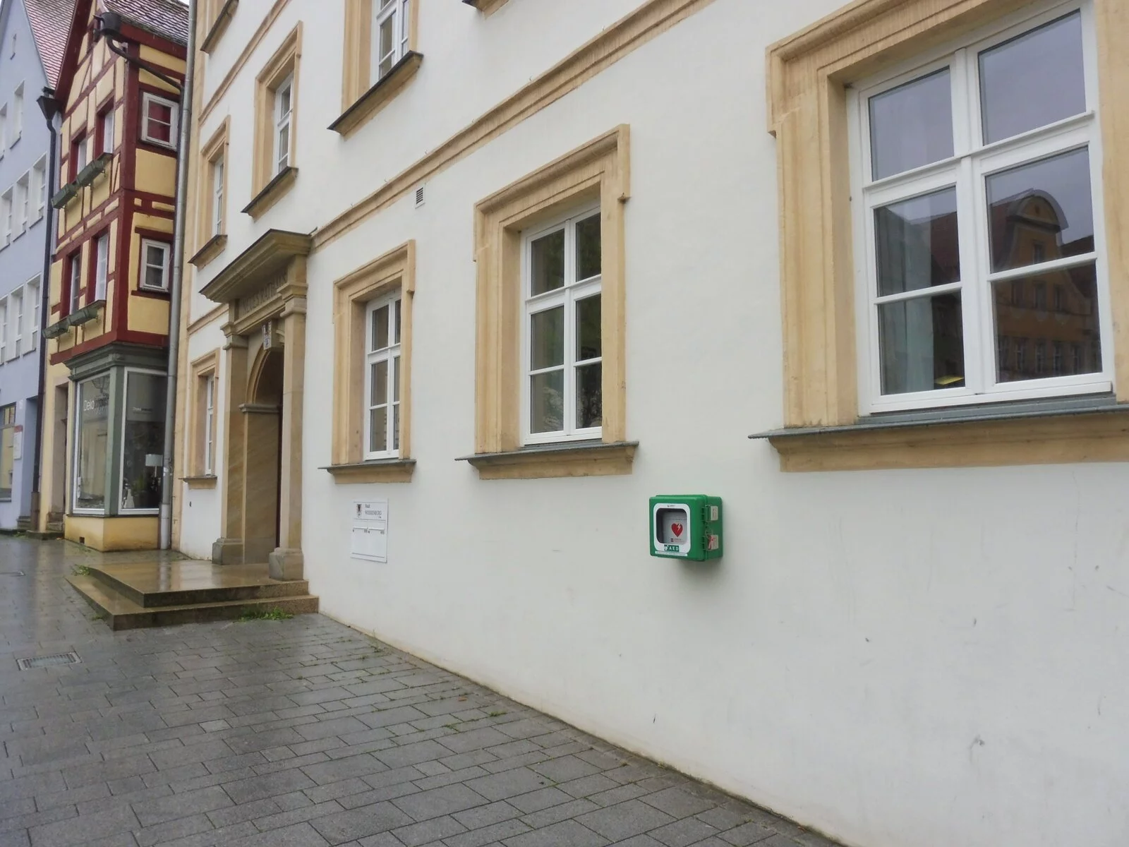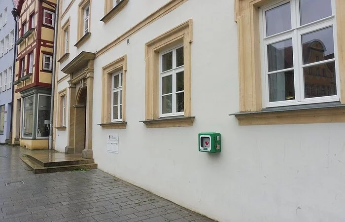 Defibrillator an der Hauswand rechts neben der Eingangstür vom Marktplatz aus