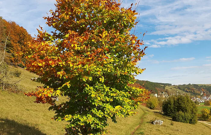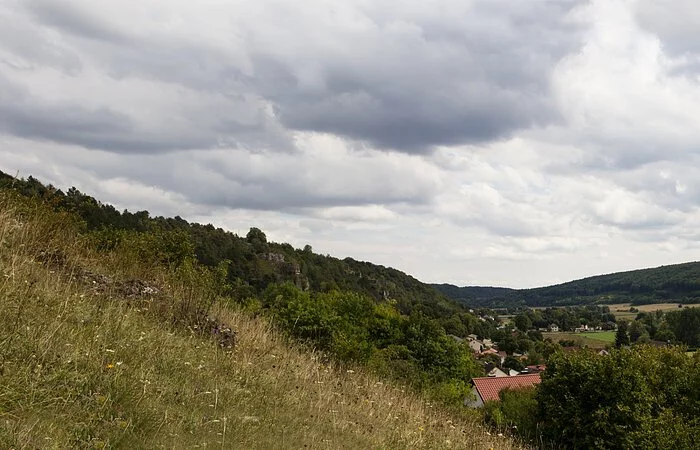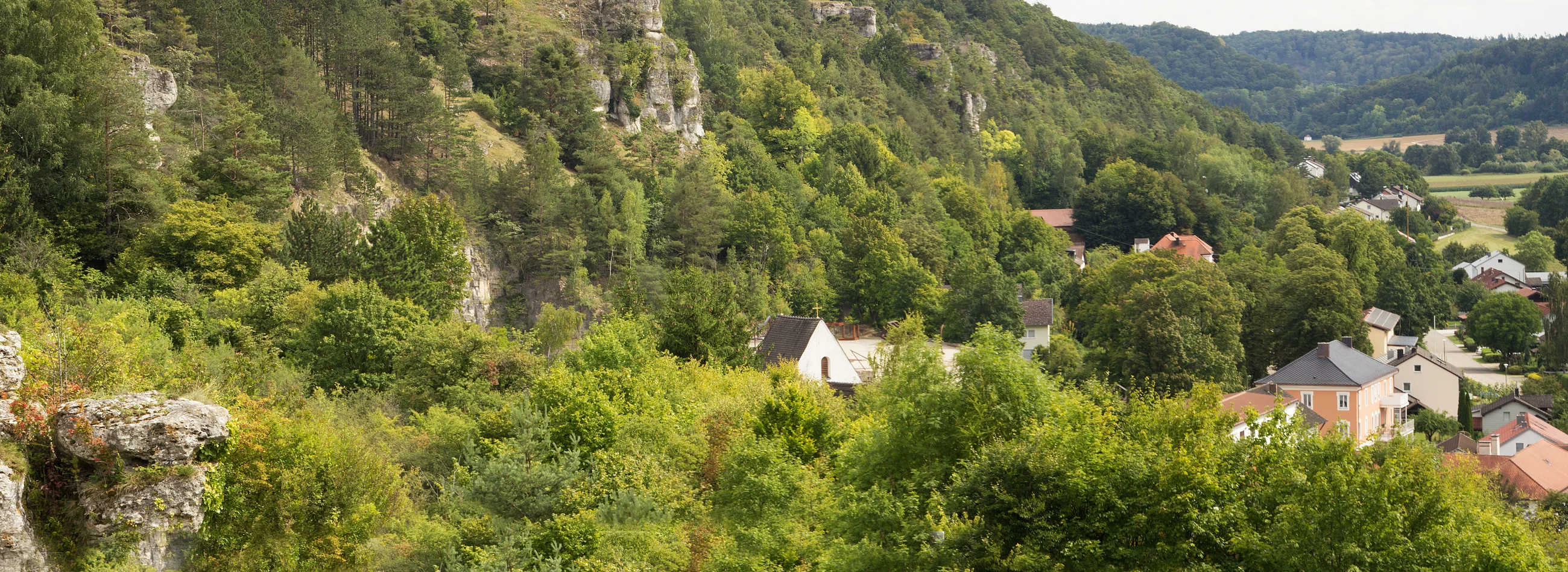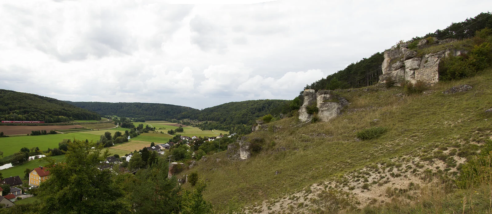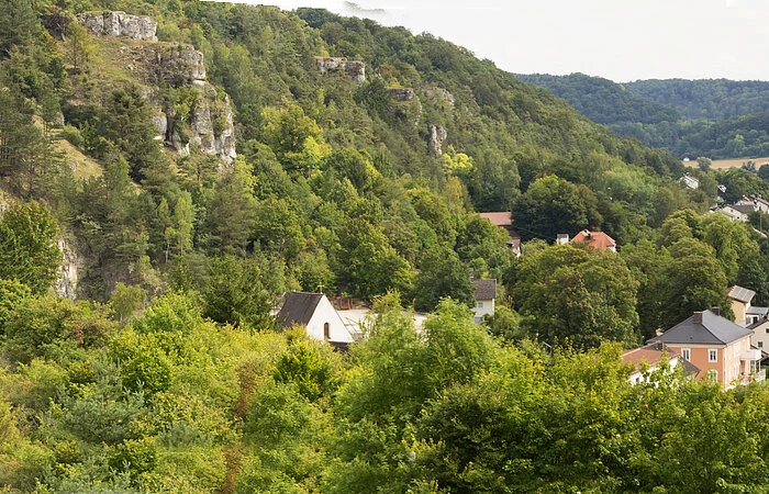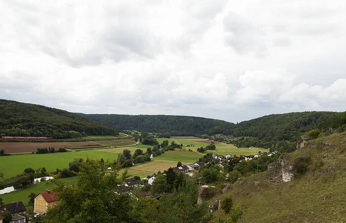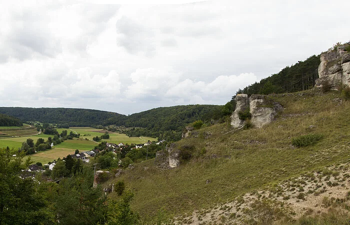 Der großflächige Trockenhang, an dessen Fuß sich der Ort Obereichstätt schmiegt, wird von zahlreichen Dolomitfelsen geschmückt.