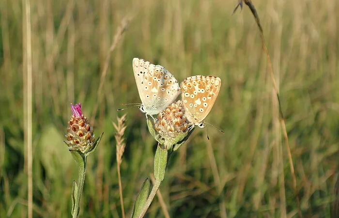 Deutschlands prächtigste und seltenste Spinne, die Zinnoberrote Röhrenspinne, ist Bewohnerin des Obereichstätter Hanges; das Männchen führt bei Gefahr mit seinem roten, schwarzbepunkteten Hinterleib wippende Drohbewegungen aus. Weniger auffällig und gerade deshalb etwas Besonderes ist die "Berghexe". Dieser graubraune, weißgefleckte Augenfalter ist zum einen sehr selten und zum anderen schwer zu entdecken. Wenn man Glück hat sieht man ihn kurz einmal unruhig über Kalksteinschutt huschen, aber dann verschwindet er ganz plötzlich. Das liegt daran, dass er mit geschlossenen Flügeln so gut getarnt ist und nahezu komplett mit dem Untergrund verschwimmt. Die Küchenschellen, die im Frühjahr mit ihrem leuchtenden Violett den Obereichstätter Hang überziehen, erhalten Besuch von der Zweifarbigen Schneckenhaus-Mauerbiene, deren Kopf und Brust samtschwarz behaart sind, während der Hinterleib rotgolden schimmert; diese Biene baut eines der wunderbarsten Nester: Für jedes Ei sucht sie ein leeres Schneckenhaus, bringt darin neben dem Ei Futter für die Larve unter, "vermauert" dann die Öffnung mit Steinchen und zerkauten Blättern und errichtet schließlich über dem Schneckenhaus ein zeltförmiges Schutzdach aus dürren Gräsern. Eines der sonderbarsten Tiere des Obereichstätter Hanges können wir antreffen, wenn wir einen größeren Kalkstein anheben. Häufig wimmelt es darunter von flinken schwarzblauen, braunfüßigen Bombardierkäfern. Werden die knapp 1 cm großen Käfer angegriffen, bringen sie im Hinterleib Drüsensekrete zur "Explosion", wodurch mit Gasdruck eine beißende Lösung ausgespritzt wird. Gelegentlich ist sogar der "Abschussknall" und der "Pulverdampf", ein kleines schleierartiges Wölkchen, wahrnehmbar. Selbst Vögel spucken einen Bombardierkäfer sofort wieder aus, wenn er ihre Mundhöhle "bombardiert".