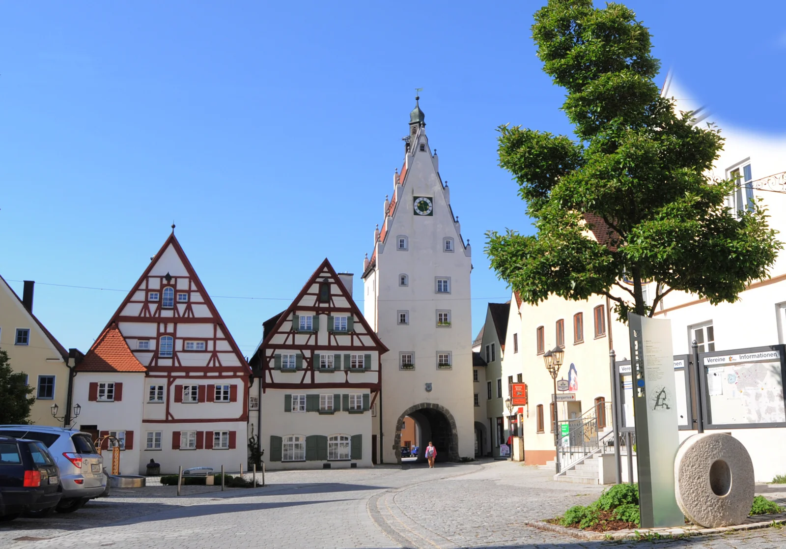 Das Obere Tor, auch Donauwörther Tor genannt, wurde um 1350 erbaut und ist gemeinsam mit den Moserhäusern das Wahrzeichen der Stadt Monheim. Mit seinen 32 Metern Höhe und der markanten Durchfahrt prägt der Turm seit Jahrhunderten das Stadtbild. Zur Feldseite hin ergänzt ein später angebauter Vorbau das historische Bauwerk. Ganz oben auf dem Dach befindet sich ein Storchennest, das dem Turm eine besondere, lebendige Ausstrahlung verleiht.