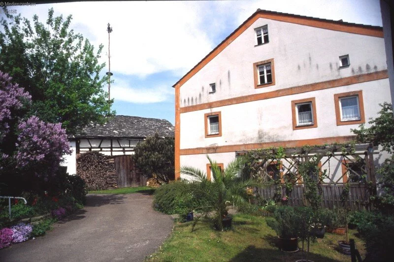 Der zugehörige Fachwerkstadel ist ein Dokument für die ursprüngliche landwirtschaftliche Abgabeverpflichtung von Naturalien zur Versorgung des Geistlichen. 1869 ist er durch Brand beschädigt und wieder aufgebaut worden. Beide Gebäude verfügten über das landschaftstypische Legschieferdach aus Solnhofener Steinen.