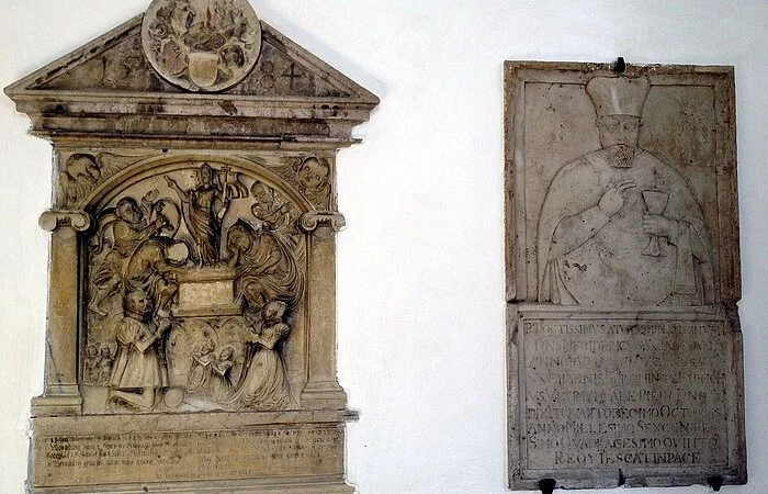 Weitere bedeutende Ausstattungsstücke: Ein eindrucksvolles Relief der Kreuztragung aus der Zeit um 1420/30, das früher im Mittleren Torturm angebracht war. Bemalte Flachreliefs und kunstvoll gestaltete Epitaphien, die bei der Renovierung 1980-82 von der Außenwand und dem Boden der Kirche an die Innenwände angebracht wurden, reichen bis in die Frühzeit des 13. Jahrhunderts zurück.