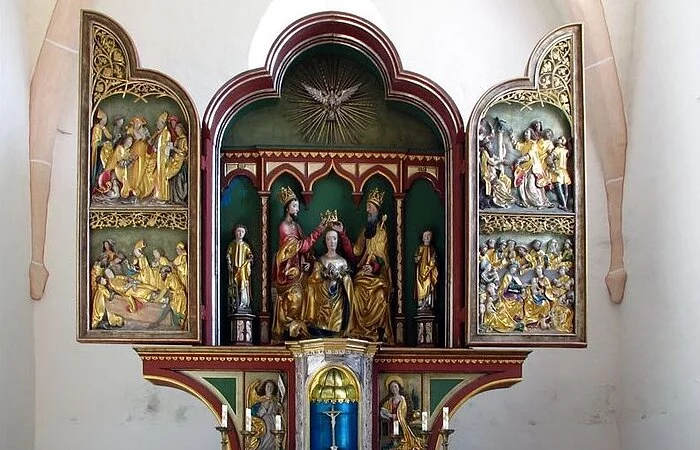 Innenraum und Ausstattung: Der Innenraum befindet sich etwas unter dem Niveau des Bodens. Der Chor im Untergeschoß des Turmes besitzt ein gotisches Kreuzrippengewölbe, die Abmessungen der Kirche sind in der Länge 31.64 Meter und in der Breite 12,71 Meter. Der Hochaltar (ein spätgotischer Flügelaltar) birgt im Gehäuse von 1868 spätgotische, bemalte Schnitzarbeiten, in der Mitte eine beeindruckende Gruppe der Krönung Mariens und daneben kleinere Figuren von Laurentius und Stephanus. Beachtenswert ist in der Südseite des Altarraums das Fragment einer Sakramentsnische mit dem Haupt des Salvators aus der Spätzeit des 15. Jahrhunderts. An der Süd- und Nordseite des Altarraums befinden sich zwei zierliche Figuren-Grüppchen mit je sieben Nothelfern (Ende 16. Jahrhundert).