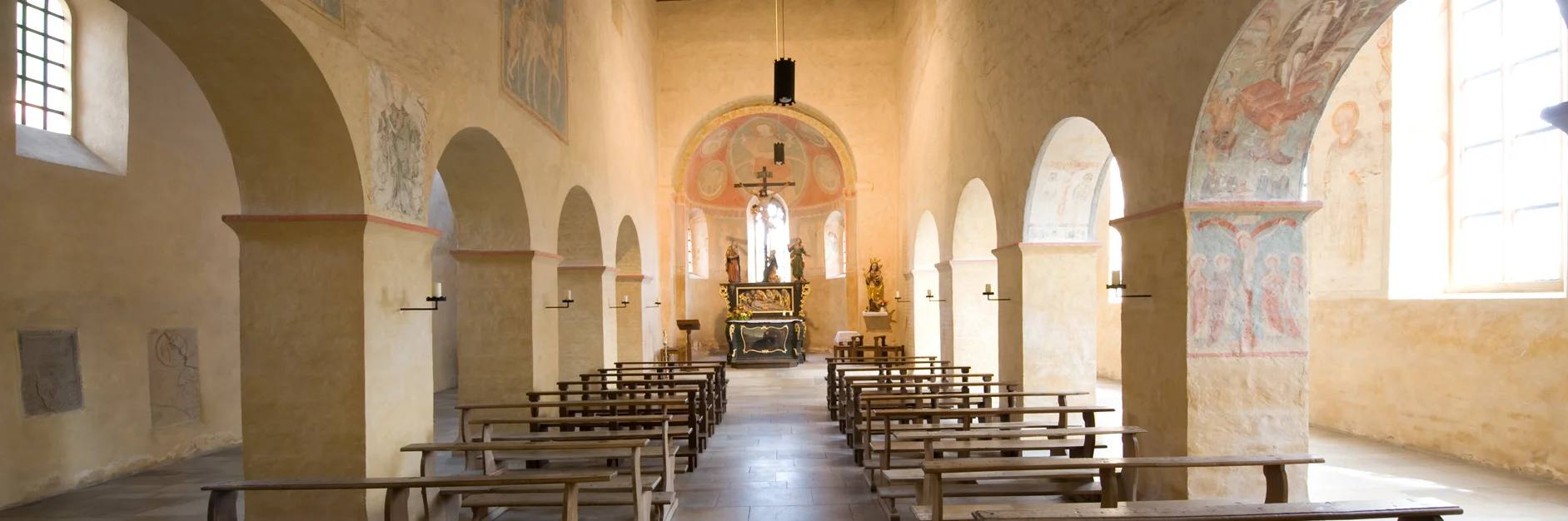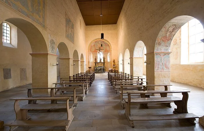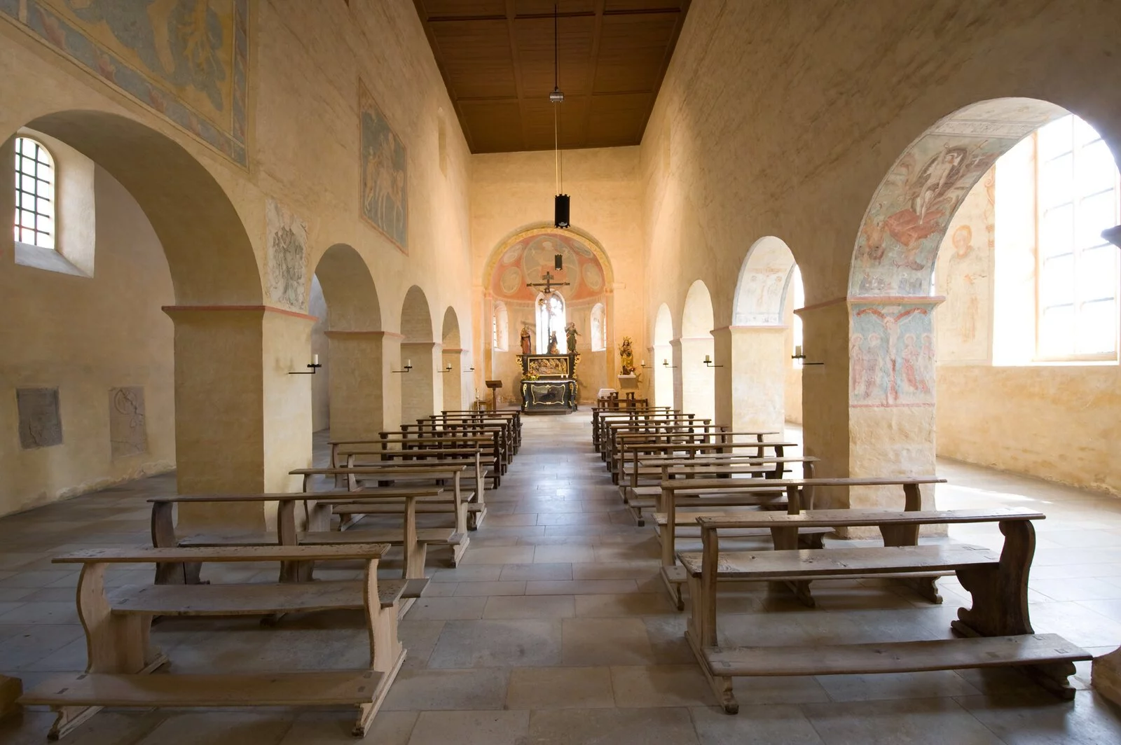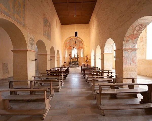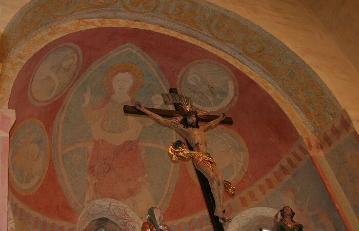 Die Bemalung der Hauptapsis stammt aus der Erbauungszeit der Basilika und zeigt Christus auf dem Regenbogen thronend, in der linken Hand die Weltkugel haltend, die Rechte zum Segen erhoben. Umrahmt wird dieses Motiv von den Symbolen der vier Evangelisten. Bemerkenswert ist die um 1510 geschaffene spätgotische Holzfigur St. Maria mit dem Jesuskind rechts der Mittelapsis. Im Mittelschiff zeigt ein Fresko aus dem 15. Jahrhundert den Kirchenpatron St. Martin auf einem Schimmel, wie er seinen Mantel mit dem Schwert für einen Bettler teilt. Das große Christophorusbild weiter vorne im Mittelschiff entstand um 1370. Am dritten Pfeiler der Nordseite befindet sich eine kleine Darstellung der hl. Dorothea mit Blumenkorb und Palme aus der Zeit um 1420. An der gegenüberliegenden Arkade auf der Südseite zeigt ein Fresko aus dem 14. Jahrhundert den gekreuzigten Heiland mit vier Heiligenfiguren.