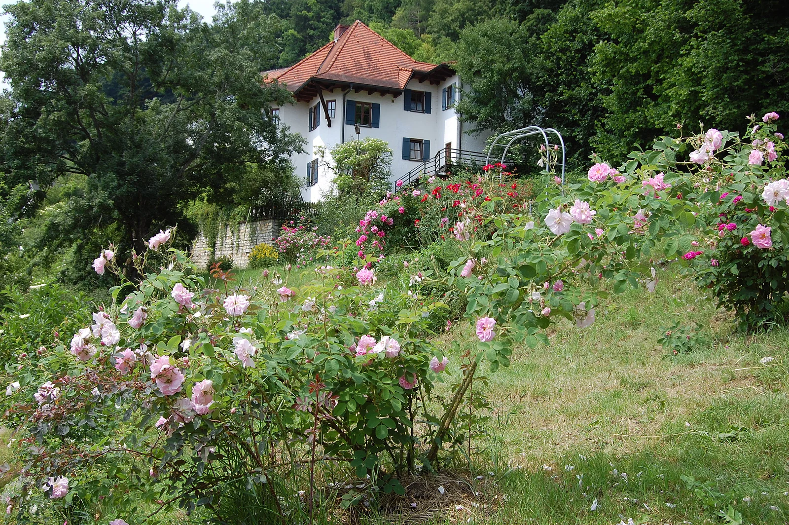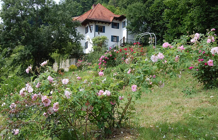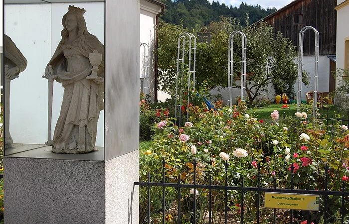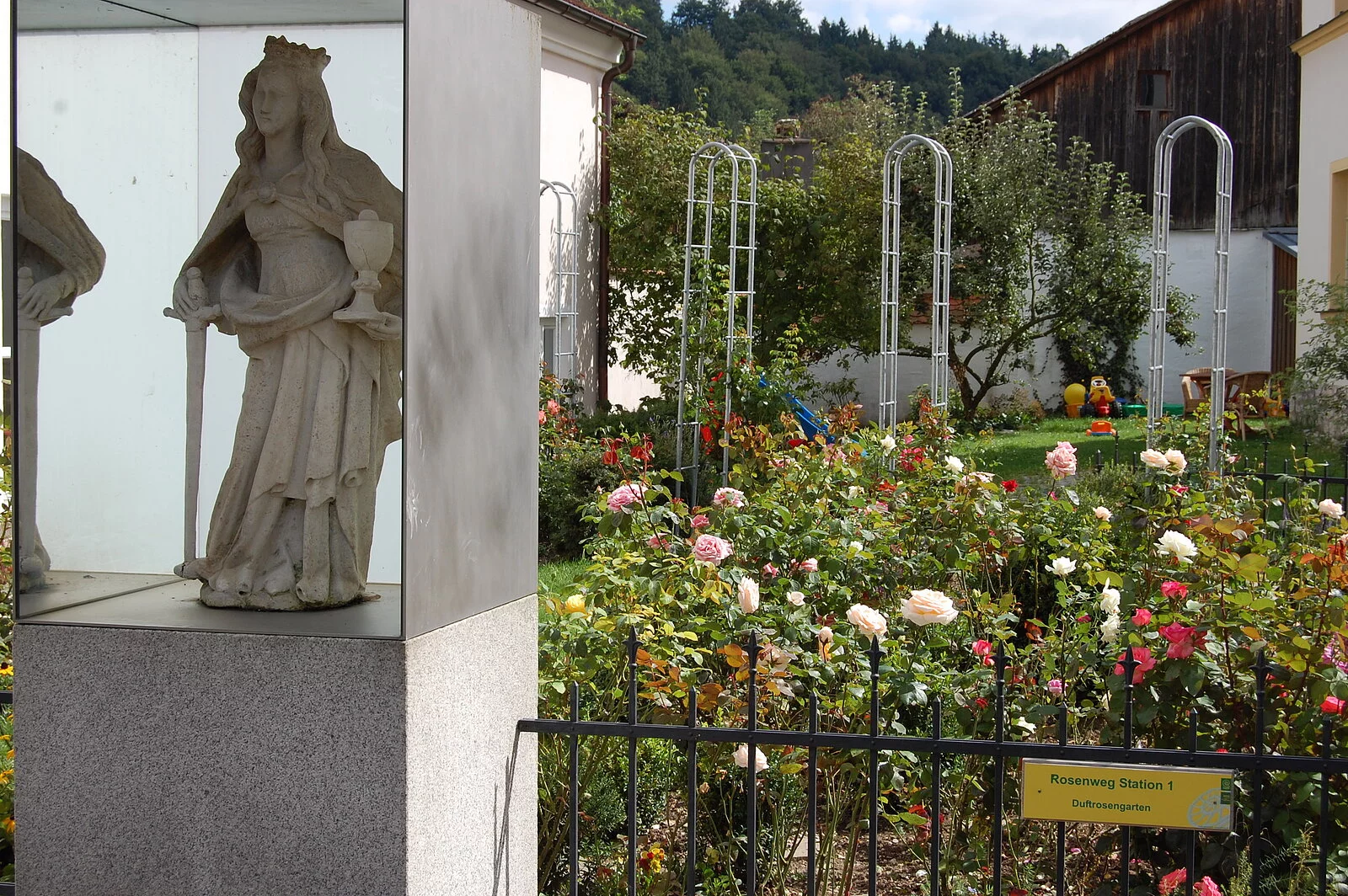 Der Rosenweg führt vom Marktplatz in Breitenbrunn, ausgeschildert als Wanderweg Nr. 1, ins Ehtal nach Buch, vorbei am Wildrosengarten zur malerischen Bachhauptmühle und zurück nach Breitenbrunn. Entlang dieses Weges befinden sich in Breitenbrunn und Buch auf öffentlichen Flächen und in Privatgärten 16 Stationen. Diese Beete und Themengärten greifen verschiedene Themen rund um die Rosen auf. Sie zeigen u.a. Duftrosen, Historische Rosen, die Eltern unserer modernen Rosen, Kuriositäten rund um die Rose, Rosenäpfel oder Bauerngartenrosen.