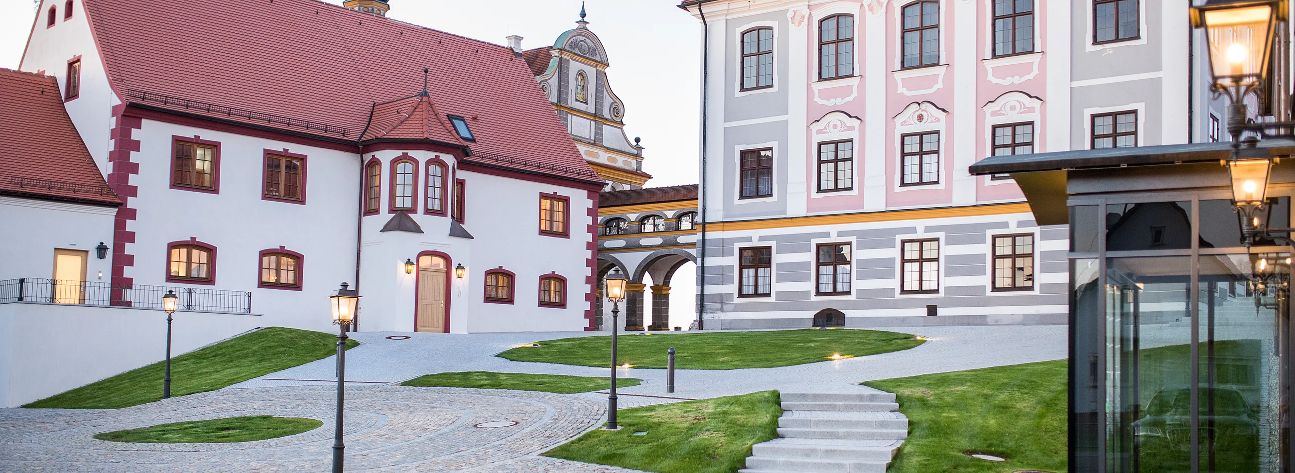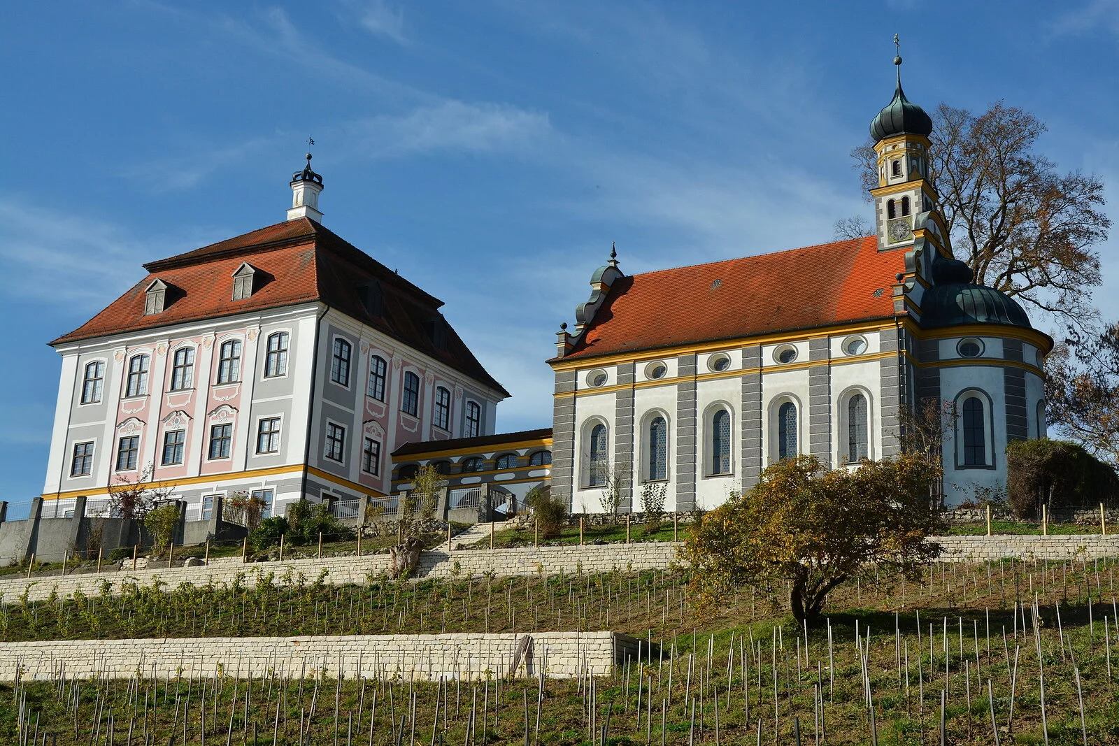 Hoch über den Ausläufern des fränkischen Juras eröffnet sich von der Schlossterrasse über einem malerischen Weinberg und einer authentischen Kulisse ein atemberaubender Blick in die Donau-Lech-Ebene.