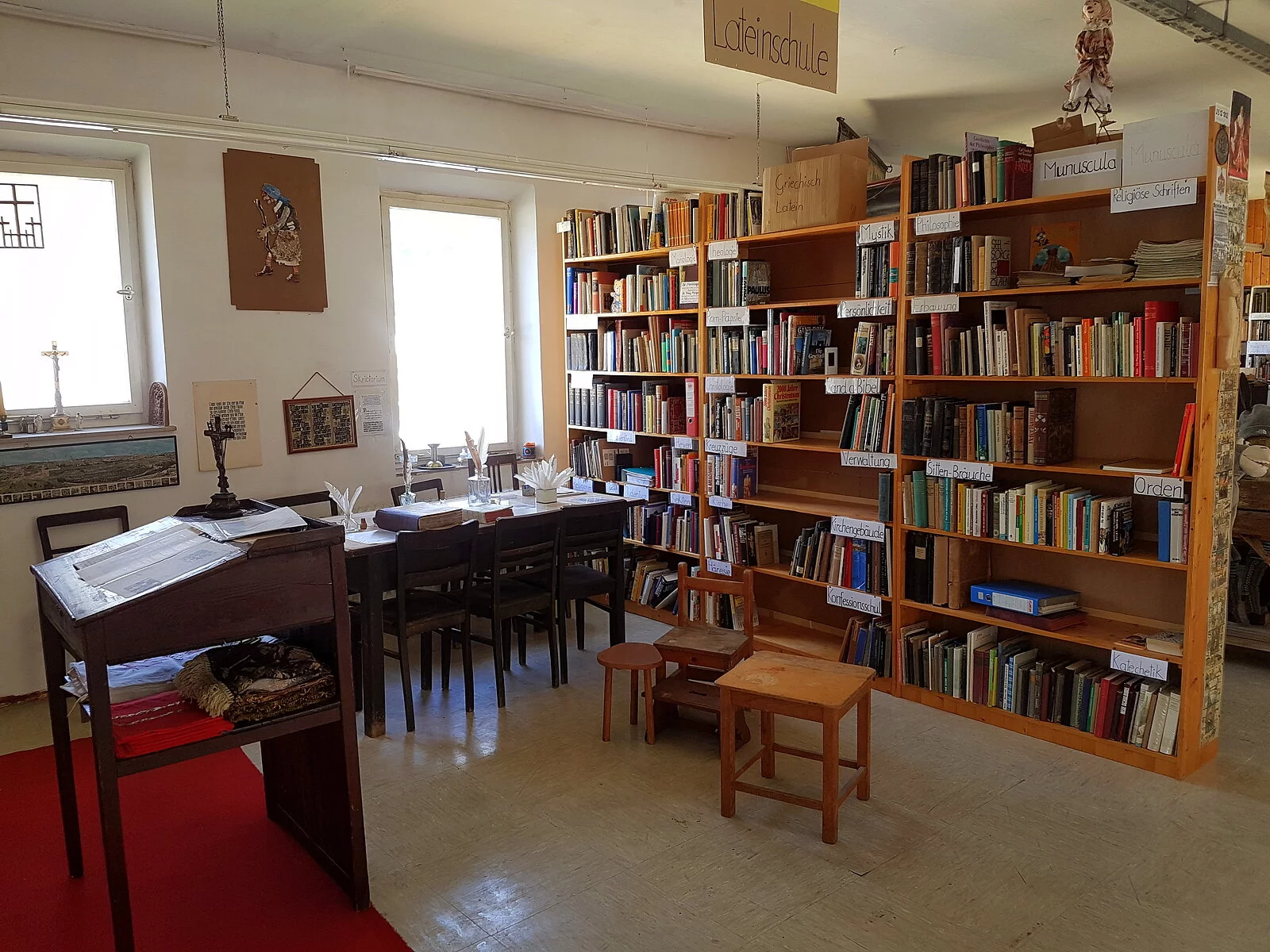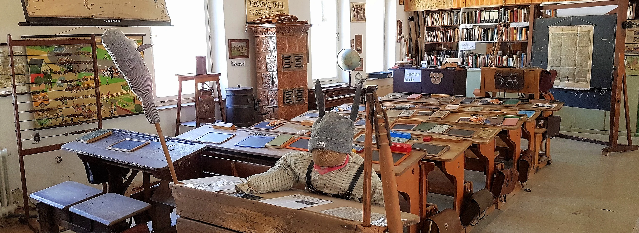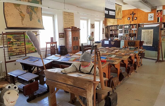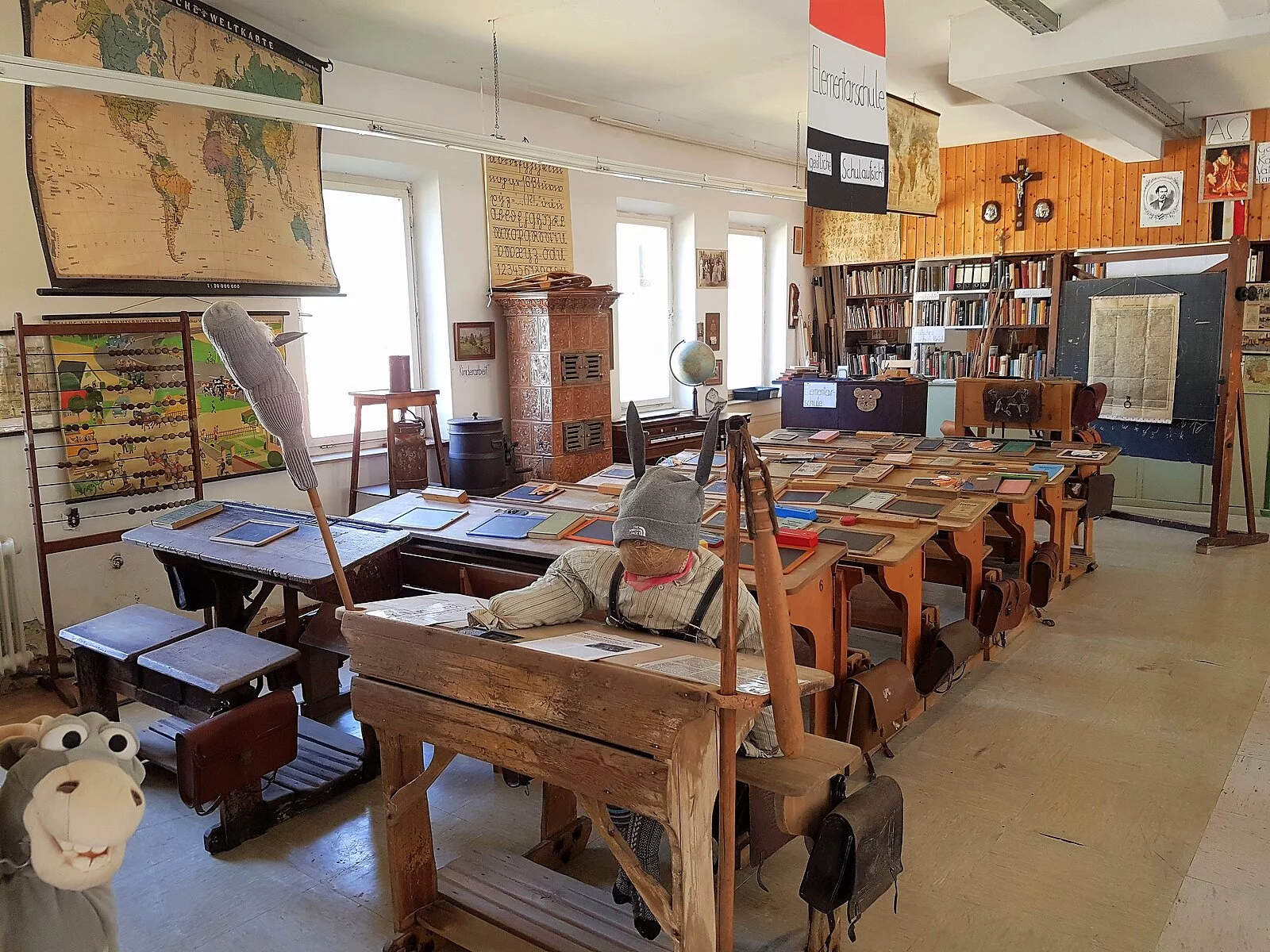 Auf rund 300 m² Fläche in acht unterschiedlichen Klassenzimmern, beginnend mit den ersten kirchlichen Schuleinrichtungen bis hin zum Film- und Handarbeits-/Werkraum werden Originalinventar und Details gezeigt, wie man sie heute nicht mehr sieht.