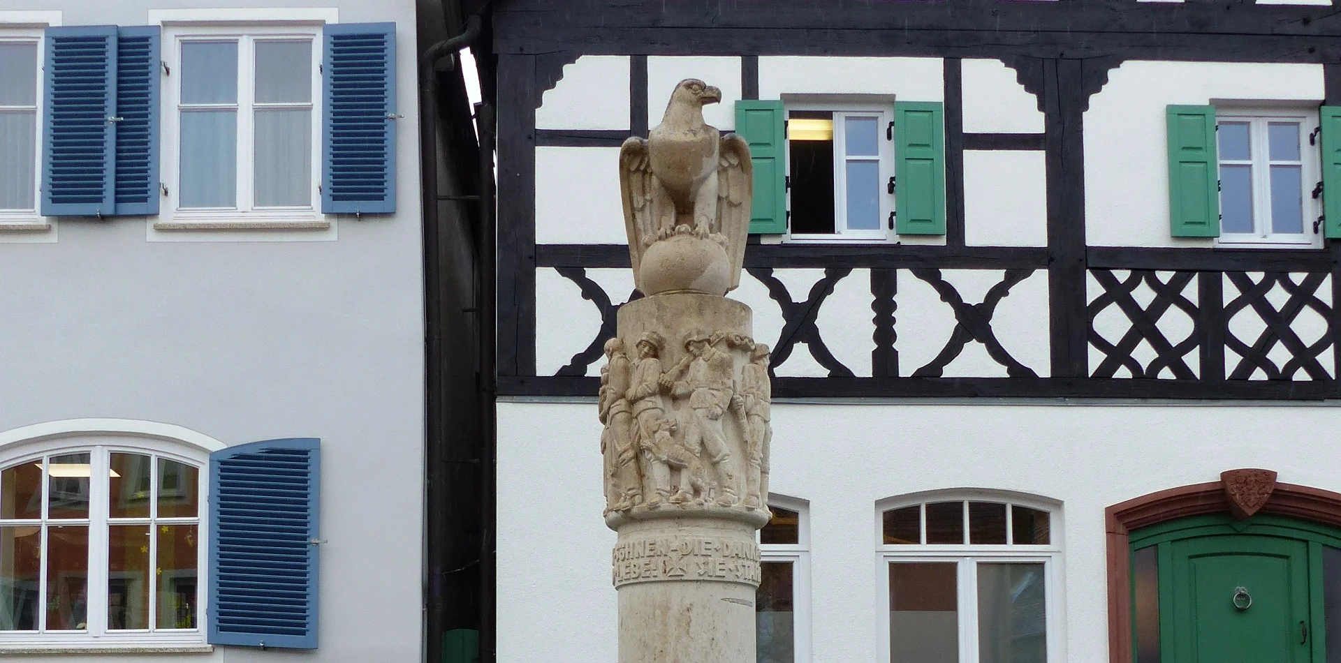 1937 erhielt er sein heutiges Aussehen als Gedenkbrunnen für die Gefallenen im Ersten Weltkrieg. Ein beauftragter Münchner Künstler ersetzte den alten Metallbrunnen durch einen achteckigen Brunnen aus Jura-Stein und setzte einen Adler ans obere Ende.