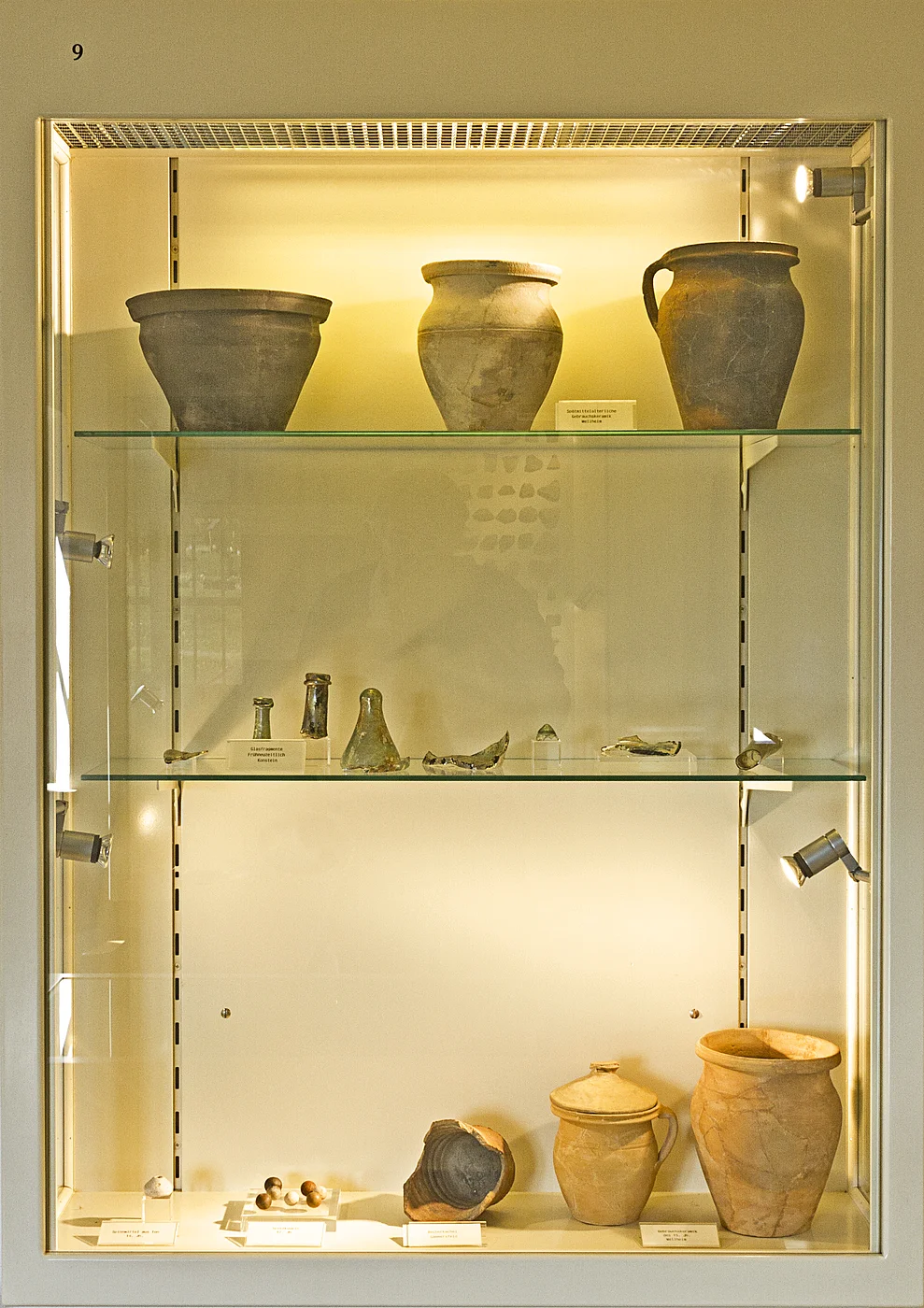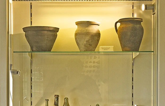 Besonderes Interesse erweckt auch der Fund eines zertrümmerten Kinderschädels aus einer Felsspalte unterhalb des Plateaus, der wohl einen Beleg für ein kultisches Menschenopfer darstellt. Weiterhin werden Funde aus einem Grabhügelfeld der Bronzezeit (um 1600 v. Chr.) sowie Keramik aus einem Hügel der Hallstattzeit gezeigt. Eine große Anzahl von Fundobjekten belegt die Eisenverhüttung in keltischer Zeit. Als Beispiel aus römischer Zeit wird eine Sumpfbrücke zum Talübergang bei der Feldmühle dokumentiert.