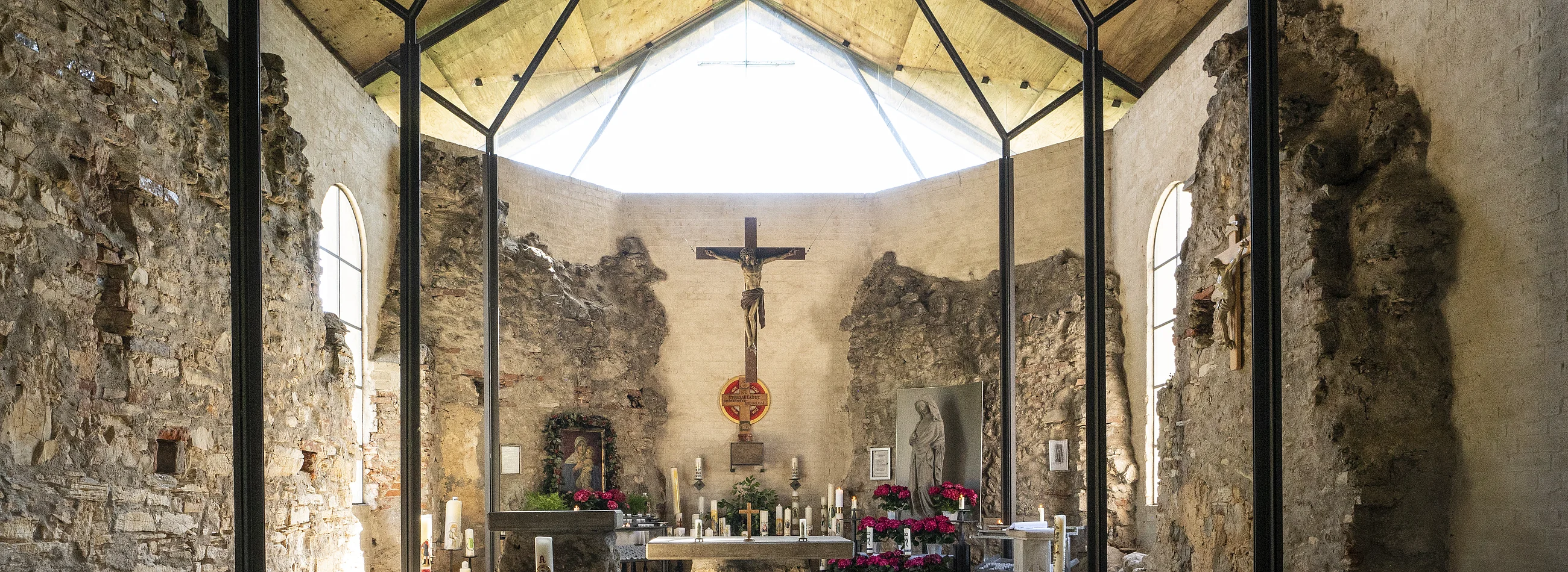 Große Teile der Umfassungsmauer sind noch bis zur Traufhöhe erhalten, insbesondere die Langhausmauern mit den Giebelwänden und die Mauern des Altarraumes mit Chorbogen. Rechts vom Chor sind noch Reste der Sakristei vorhanden.