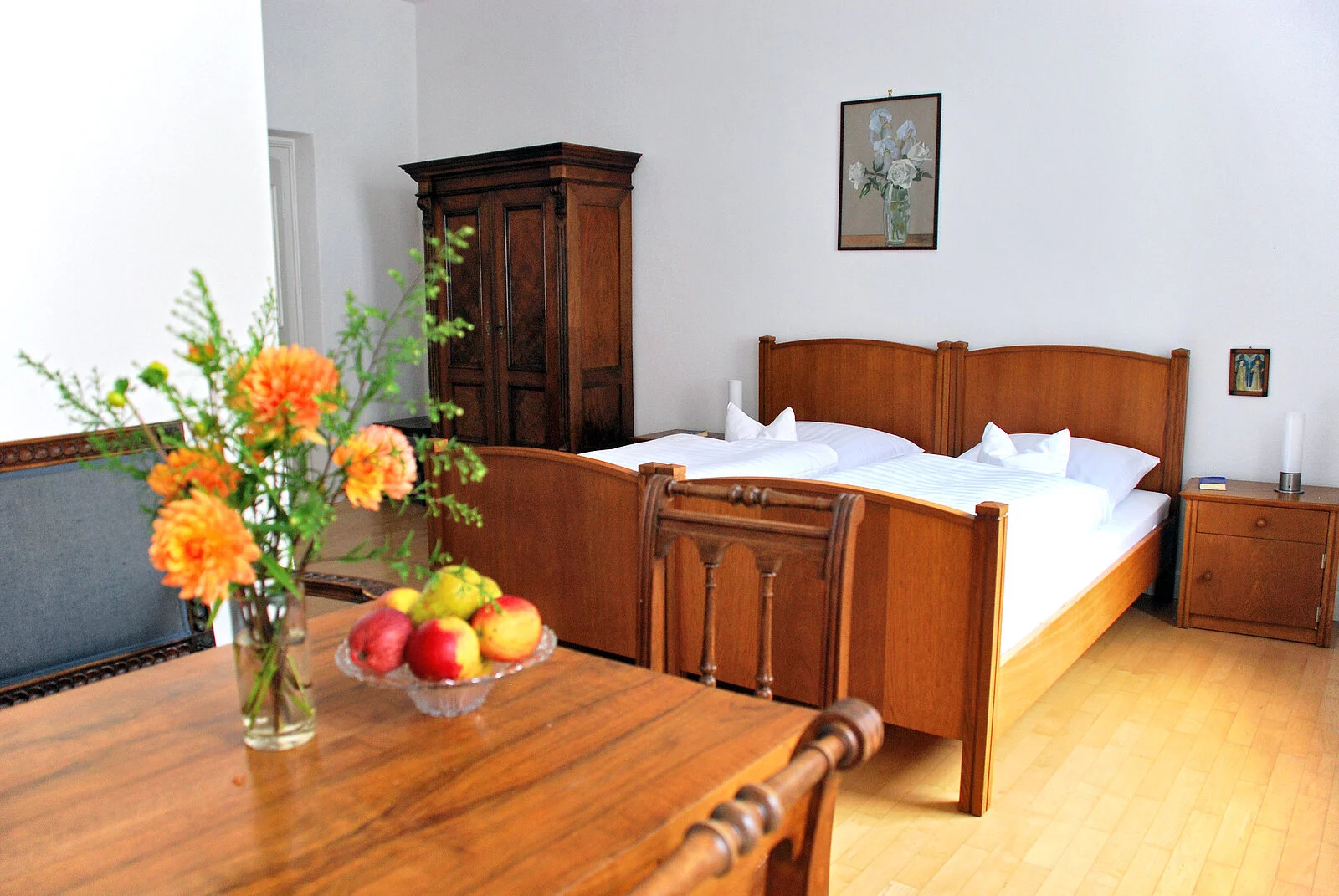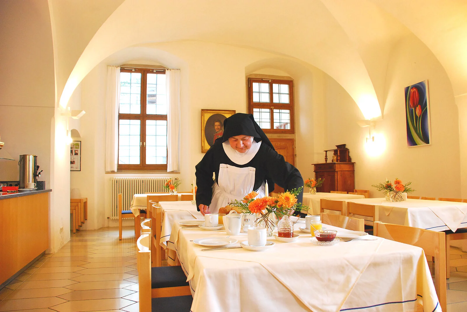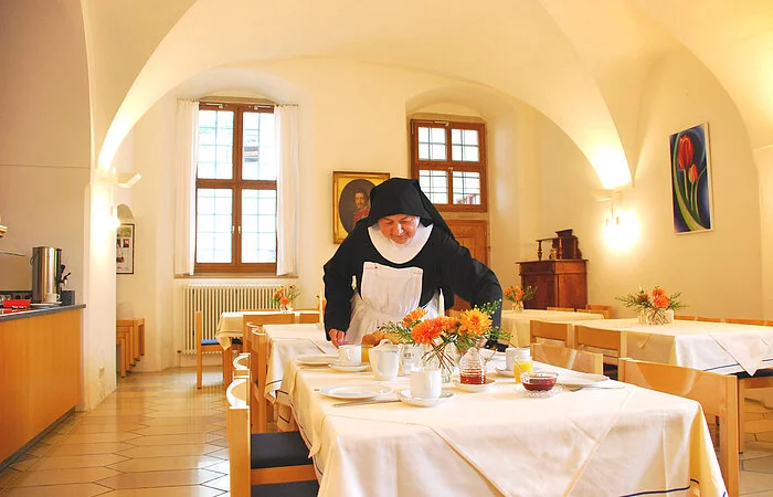 Gemäß der Regel des Heiligen Benedikt sind Gäste in St. Walburg herzlich willkommen. Die Zimmer sind mit schlichtem Komfort eingerichtet, im Gewölbesaal stärken sich die Gäste am reichhaltigen Frühstücksbuffet.