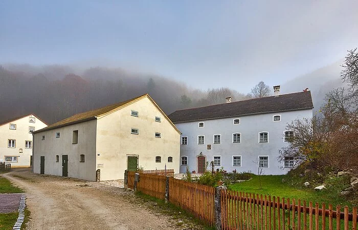 Das Ensemble befindet sich am Ausgang der Mühlbachquellhöhle, deren Wasser im Quellteich auf dem Gelände mündet und die von der Karstgruppe Mühlbach erforscht wird. Das Zusammenspiel von Architektur, Geologie und Umwelt thematisiert die Dauerausstellung „Stein.Wasser.Höhle” im Steinstadel und in einem Teil des Sägemühlstadels. Sie beschreibt Merkmale, Geschichte und Verbreitung der Jurahäuser sowie die Geschichte der Obermühle und ihrer Sanierung. In den beiden Gewölberäumen mit Blick auf den Mühlbach stellen die Höhlenforscher ihre Entdeckungen in der Mühlbachquellhöhle dar.