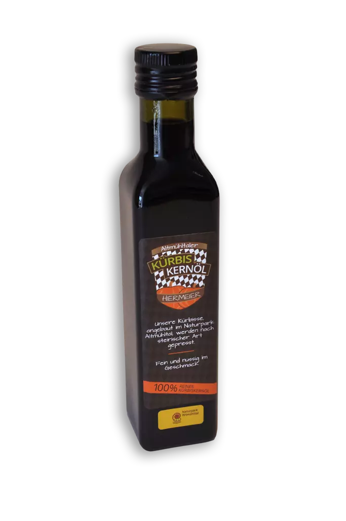 Die Kürbisse für das 100 % reine Kürbiskernöl werden im Naturpark Altmühltal angebaut und gepresst. Das kaltgepresste hochwertige Öl in Bio-Qualtät ist fein und nussig im Geschmack. Es eignet sich zum Verfeinern von warmen Speisen genauso wie für die Nachspeisenzubereitung.