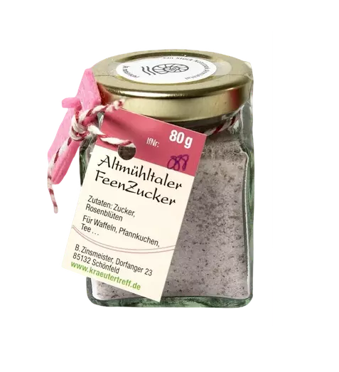 Der Feenzucker im 80-Gramm-Schmuckglas wird durch die ausgebildete Köchin und staatlich anerkannte und zertifizierte Kräuterpädagogin Brigitte Zinsmeister hergestellt.