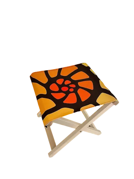 Zusammenfaltbare Fußstütze mit bedruckter Ablagefläche aus Stoff. Motiv: Ammonit-Logo des Naturparks in den Farben der Marke. Der Rahmen besteht aus hellem Holz.