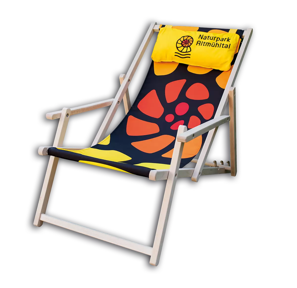 Ein schöner Holzliegestuhl aus stabilem europäischen Holz. Der Liegestuhl ist höhenverstellbar, mit Armlehnen und einem bequemen Kopfkissen.
