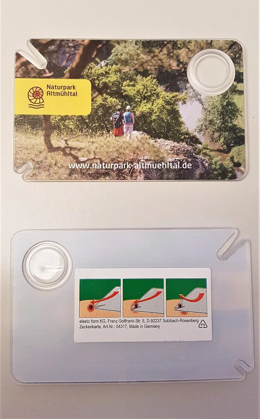 Um die unliebsamen "Gäste" am Körper schnell wieder loszuwerden, ist das scheckkartengroße Instrument sehr praktisch: Die Zecke wird in einer der beidenvförmigen Auslassungen fixiert. Die Auslassungen sind unterschiedlich groß, damit auch kleinere Zecken erfasst werden können. Durch eine Bewegung nach vorn und oben wird das Tier entfernt – die Karte fungiert dabei als Hebel. Die in der Karte integrierte Lupe erleichtert die Handhabung