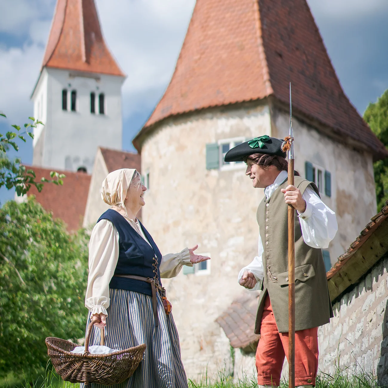 Jahrhundertelang stand Greding unter der Herrschaft der Eichstätter Fürstbischöfe. Diese Zeit wird bei der Führung im Barockkostüm auf unterhaltsame Art lebendig. Unter dem Motto „Unterm Krummstab ist gut leben“ nehmen der fürstbischöfliche Jäger Hubert oder die Zimmermannswitwe Barbara Fuchsin die Teilnehmenden mit auf Zeitreise.