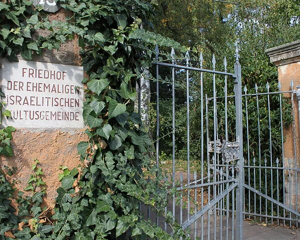Der Straßenname passt an diesem sonnigen Sonntagvormittag genau zur Stimmung: Eine tiefe Ruhe liegt über der Leonhardsruhstraße und ihrer Nachbarschaft. An Arbeitstagen mag das ganz anders sein, doch auch dann gibt es hier eine Oase der Stille. Sie verbirgt sich hinter einer unscheinbaren Mauer mit einem schmiedeeisernen Tor, das heute einladend geöffnet ist. „Friedhof der ehemaligen israelitischen Kultusgemeinde“ steht auf der Tafel daneben. Stadtführerin Elke Hartung ist bereits vor Ort und hat alles für die Führung vorbereitet. Jetzt wartet sie ab, wer kommt. Eine Voranmeldung gibt es nicht. „Ich mache die Führung ab einer Person“, erklärt sie.