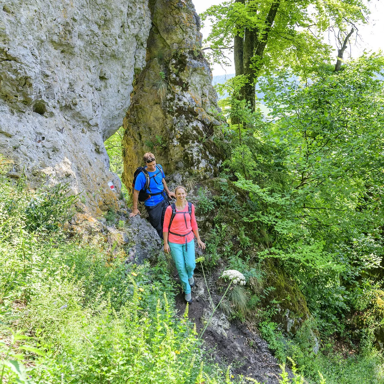 Lust auf ein Abenteuer? Bei Dollnstein führt der Jägersteig, ein steiler Pfad mit fast alpinem Charakter, durch das Naturwaldreservat Beixenhart. Über Wurzeln und Felsen geht es hier zu weiten Ausblicken über das Urdonautal.