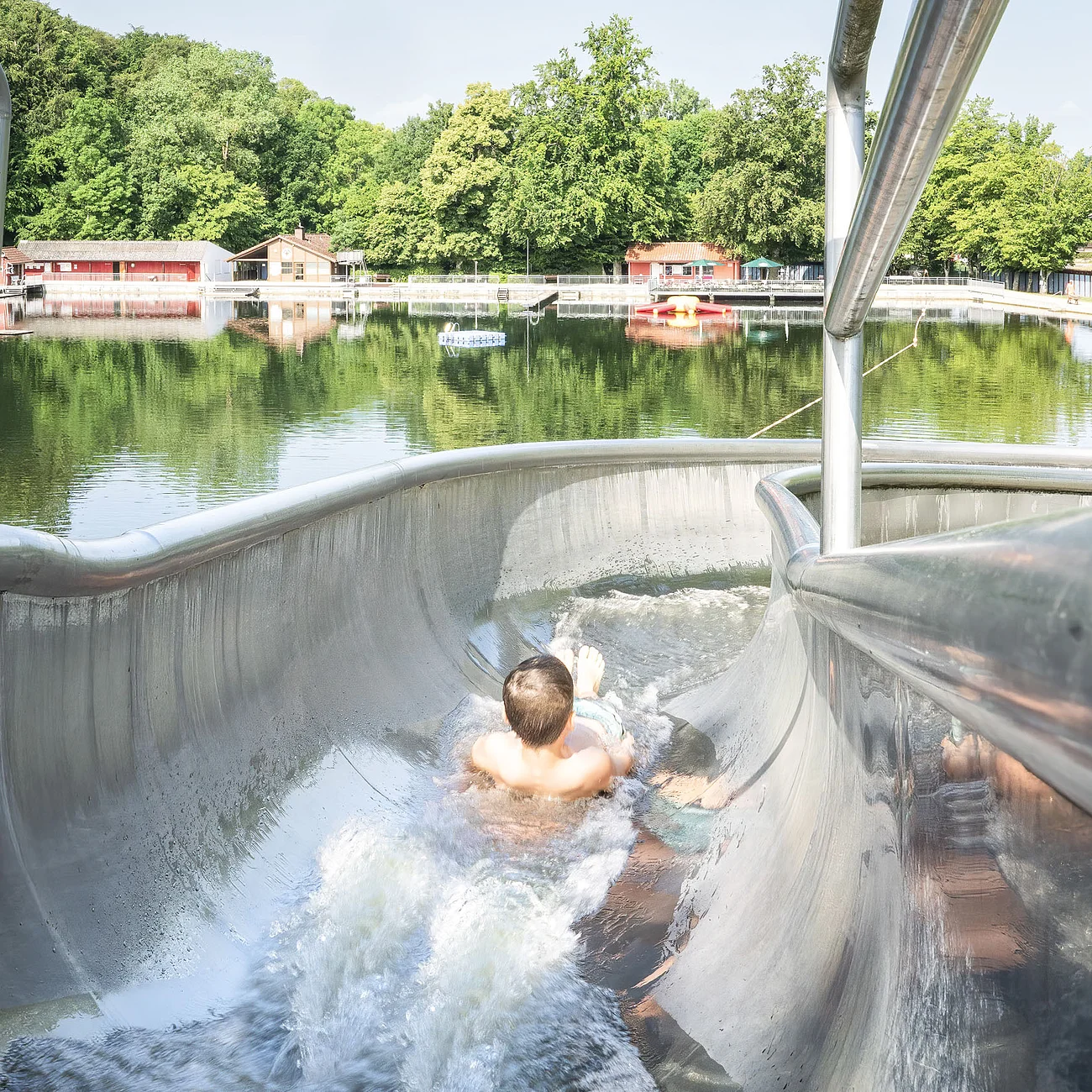Heiße Sommertage verbringen Familien am besten im Freibad am Waldsee. Wasserspaß wartet nicht nur im See, sondern auch in der 70 Meter langen Wasserrutsche oder am Wasserspielplatz.