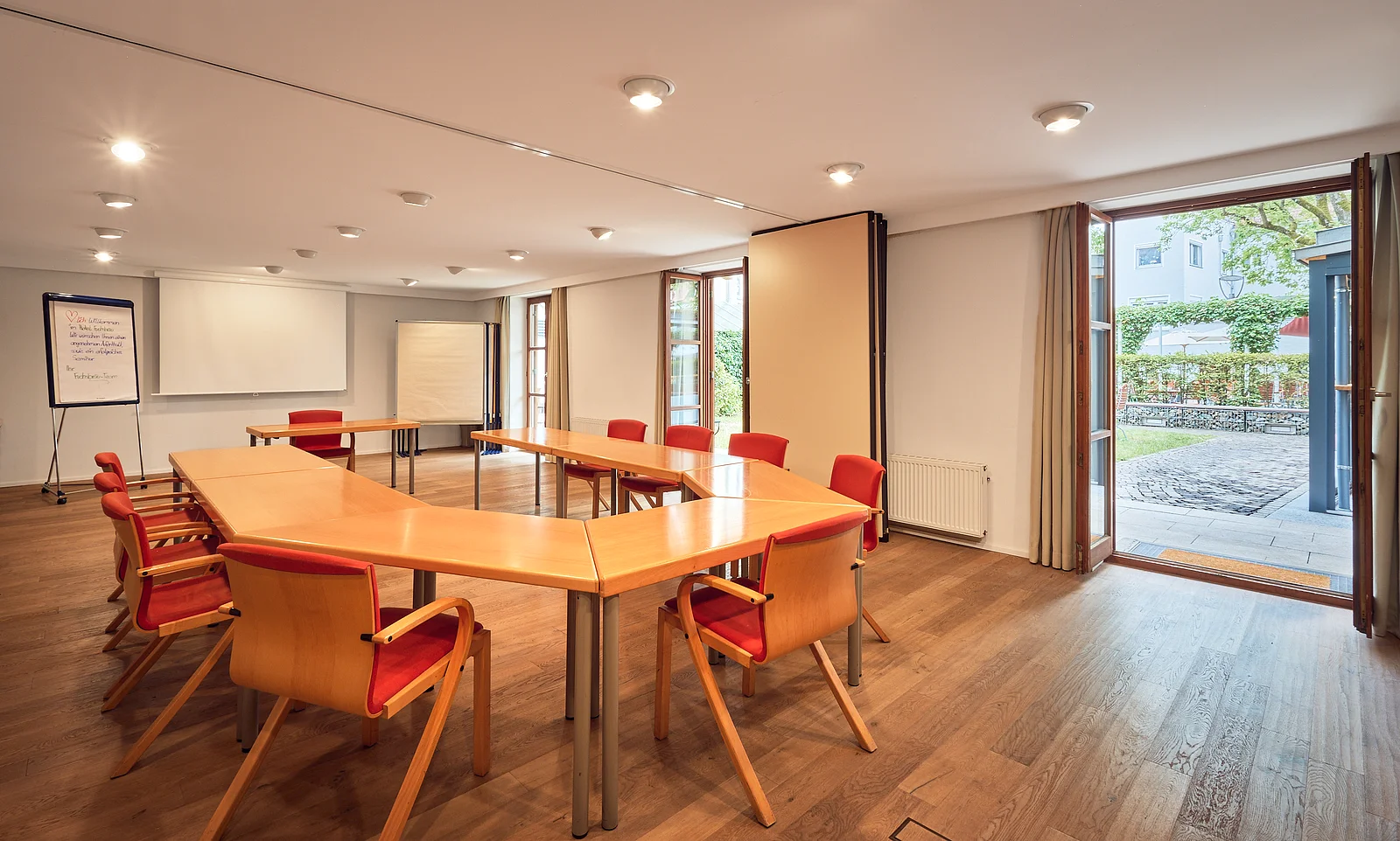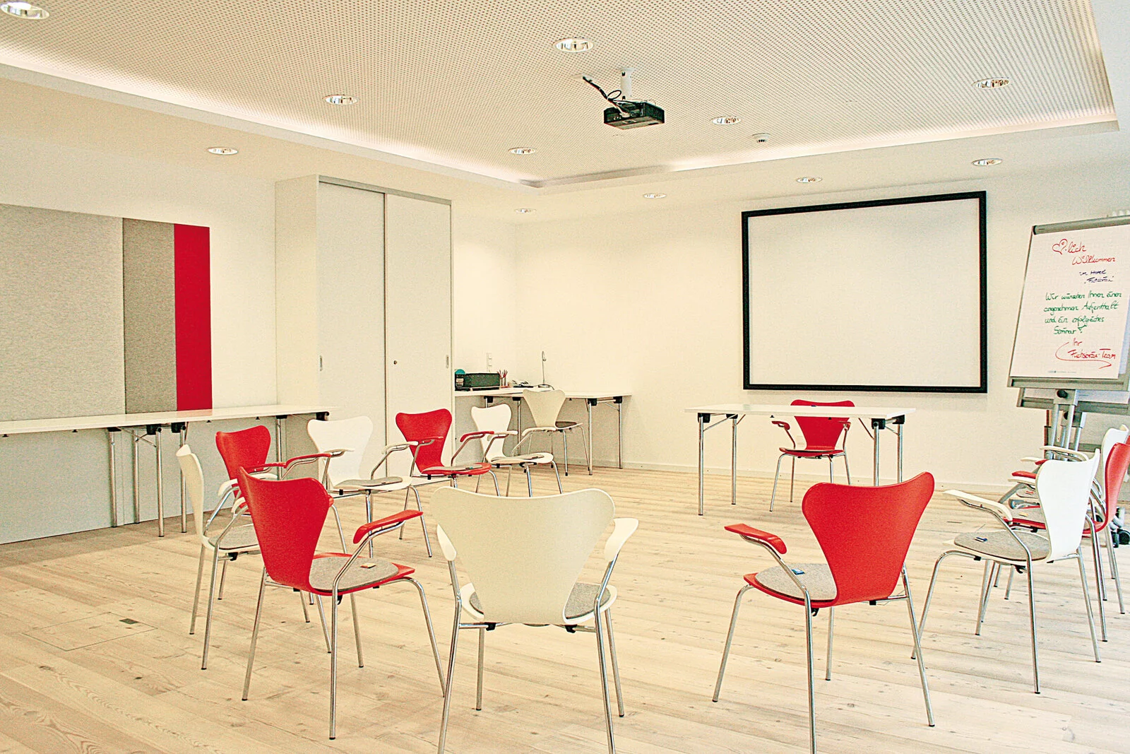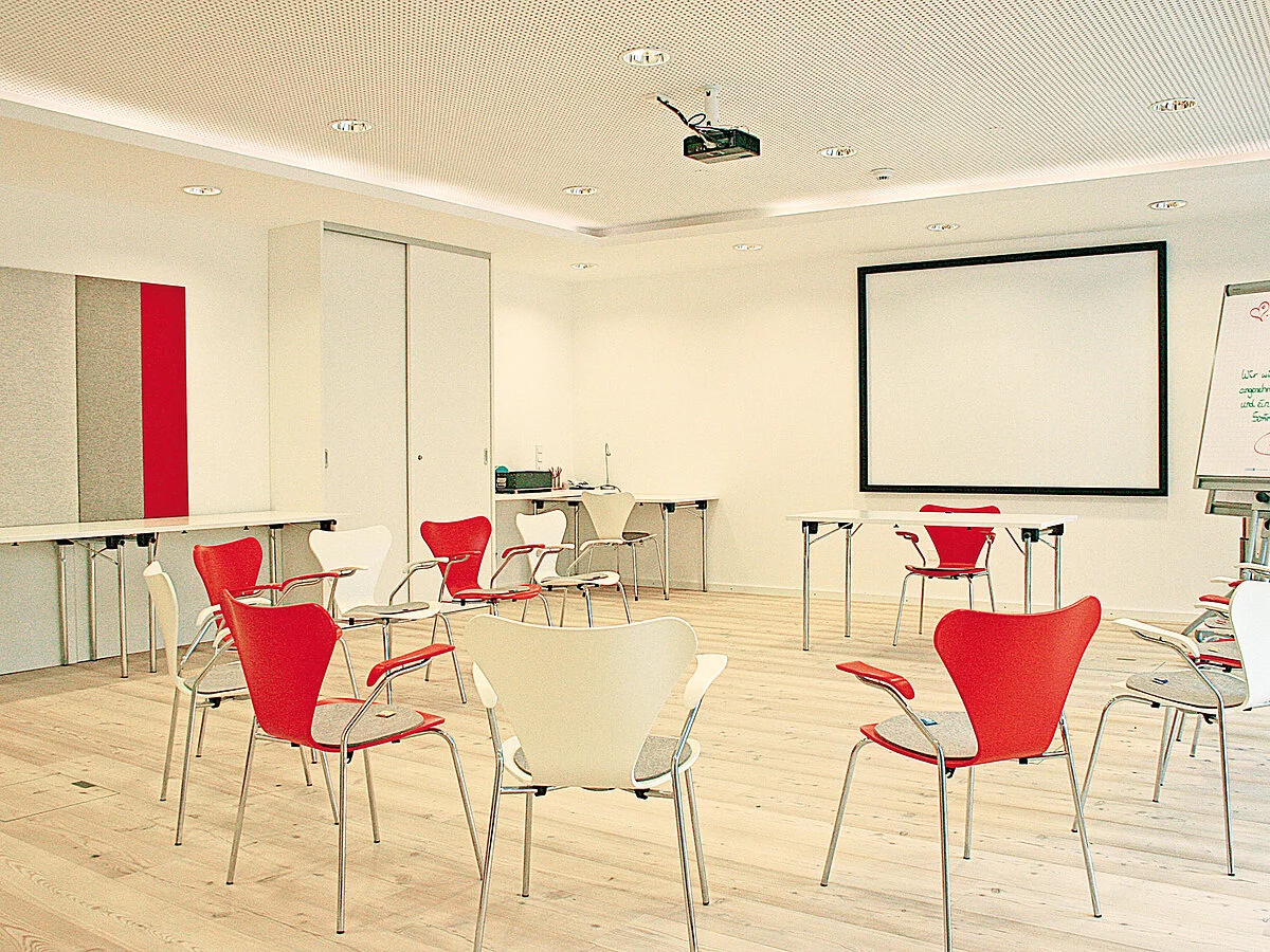• Technische Ausstattung: Alle Räume sind ergonomisch möbliert und mit modernster Technik ausgestattet, um die Präsentationen und Vorträge zu unterstützen. Beamer, Flipchart und Pinnwände gehören zur Standardausstattung, ebenso wie Tageslicht.
