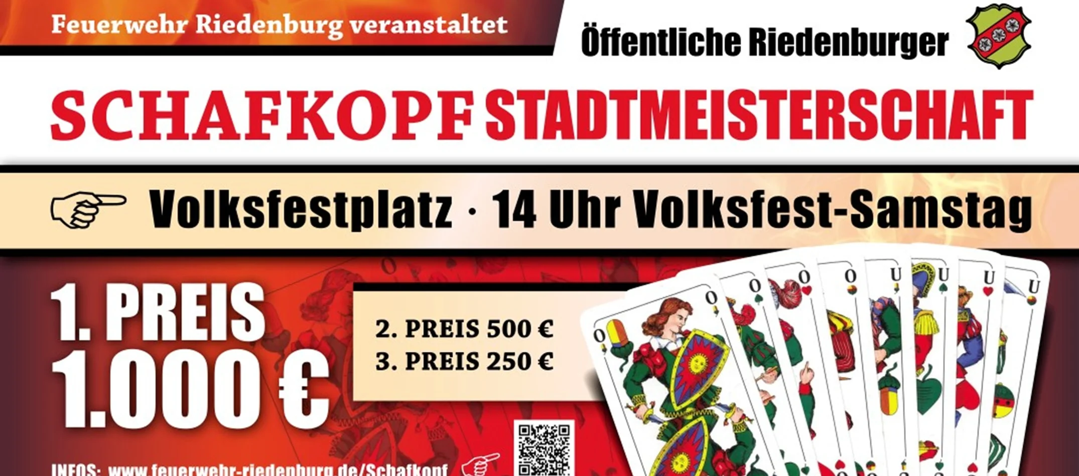 Die Veranstaltung findet am Volksfestsamstag, dem 22. August 2026 im Festzelt auf der Volksfestwiese in Riedenburg statt. Anmeldung ab: 12:30 Uhr, Anmeldeschluss 13:45 Uhr, Spielbeginn: 14:00 Uhr Auch in diesem Jahr winken wieder viele attraktive Preise für unsere Gewinner.