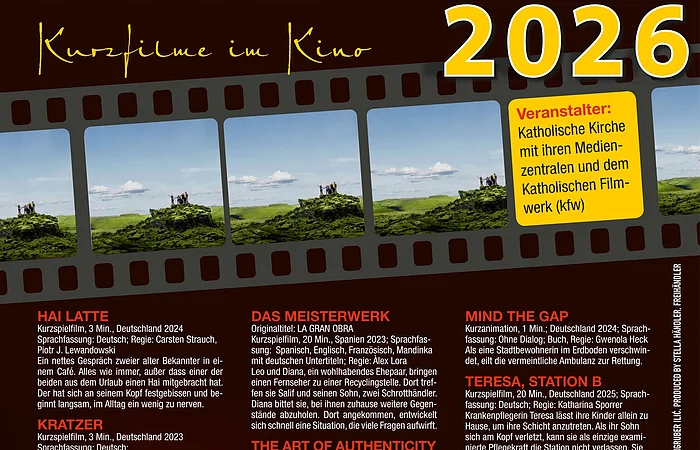 „AugenBlicke – Kurzfilme im Kino“ Seit 33 Jahren präsentiert das kirchliche Projekt inhaltlich und ästhetisch anspruchsvolle Kurzfilme auf der Kinoleinwand – Geschichten, die herausfordern, Bilder, die unsere Wahrnehmung verblüffen, Filme, die zur Auseinandersetzung und zum Gespräch anregen.