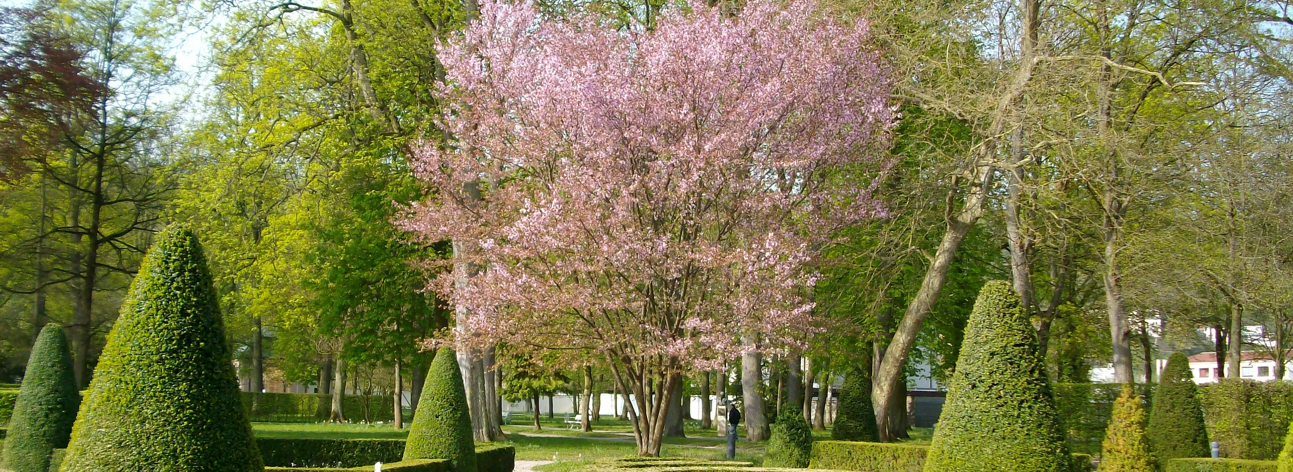 Park mit blühendem Kirschbaum und geschnittenen Hecken in konischen Formen bei Tageslicht