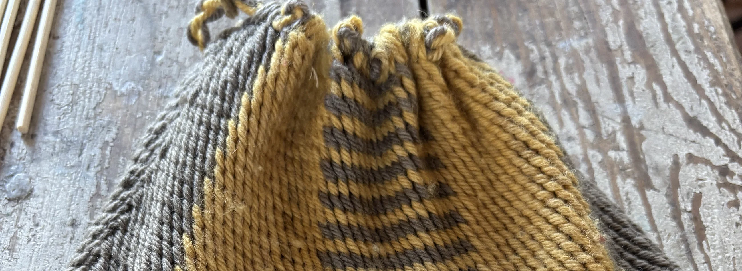 Man benötigt nur einen einfachen Rahmen zum Spannen der Fäden und ein paar Holzstäbchen zum Fixieren der Muster während des Arbeitens.