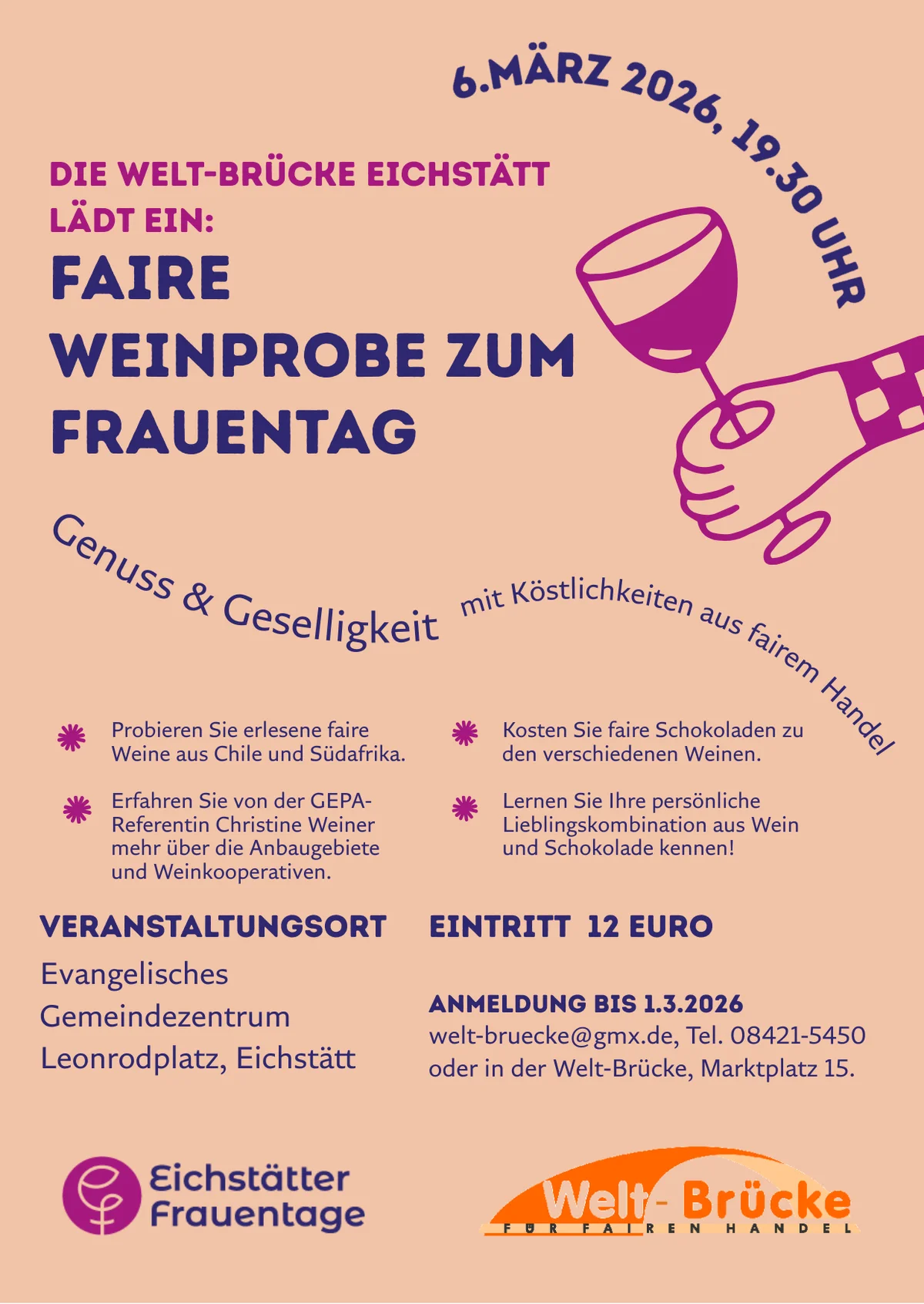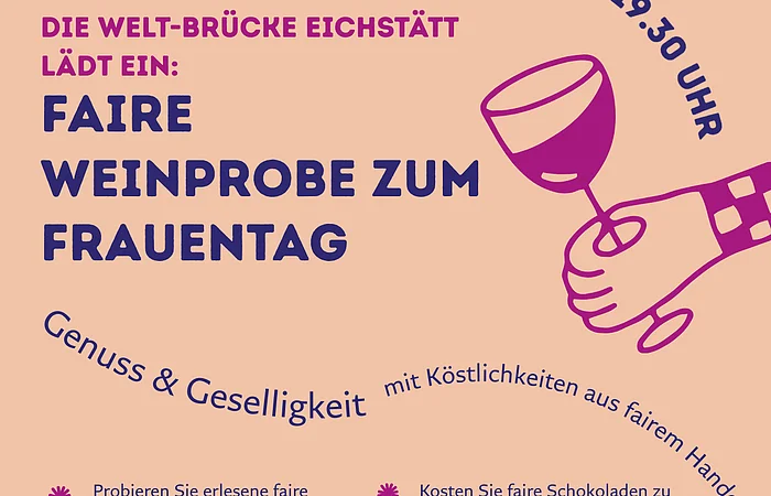 Anlässlich der „Eichstätter Frauentage“ laden die Welt-Brücke und GEPA-Referentin Christine Weiner am Weltfrauentag zu einer Fairen Weinprobe für Frauen ein. Gaumenfreuden verspricht der Abend, denn Christine Weiner, Referentin der Fairhandelsimportgesellschaft GEPA, informiert nicht nur zu fairem Wein, sondern hält auch die passende faire Schokolade dazu bereit.