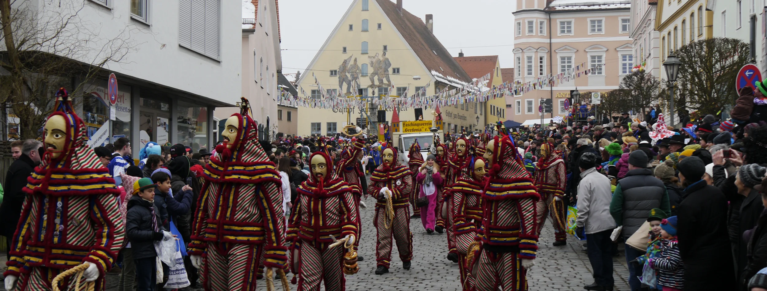 Jedes Jahr pünktlich zum Faschingsdienstag gilt in der Gredinger Altstadt der Ausnahmezustand: Ein großer, bunter Gaudiwurm mit mehr als 60 fantasievoll geschmückten Mottowägen, zahlreichen maskierten Fußgruppen und flotten Blaskapellen schlängelt sich in bester Karnevalsmanier mit viel „Gredonia helau!“ durch Gredings Straßen und über den historischen Marktplatz. Dieser wird nach dem großen Faschingszug zur gut besuchten Partymeile, wo man die letzten Stunden der närrischen Tage mit Musik und guter Laune nochmal so richtig feiern und genießen kann.