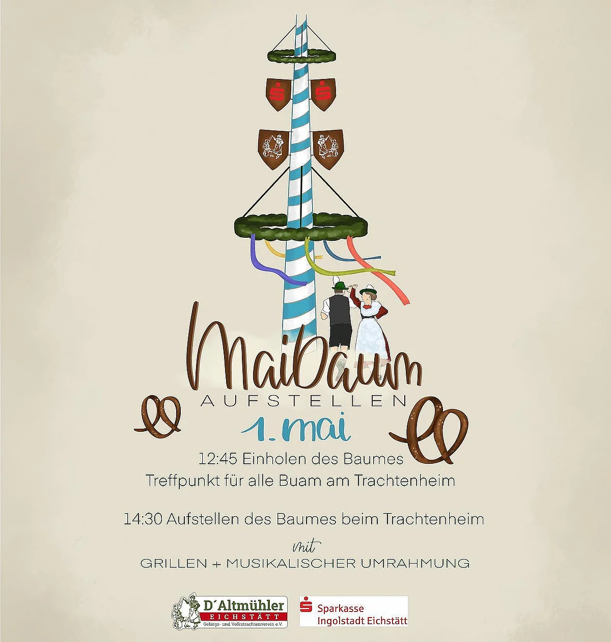 Am 1. Mai 2026 ab 14:30 uhr wird bei zünftiger bayrischer Musik wieder ein stattlich geschmückter Maibaum durch reine Muskelkraft der Vereinsmitglieder am Fuße des Frauenberges aufgestellt.
