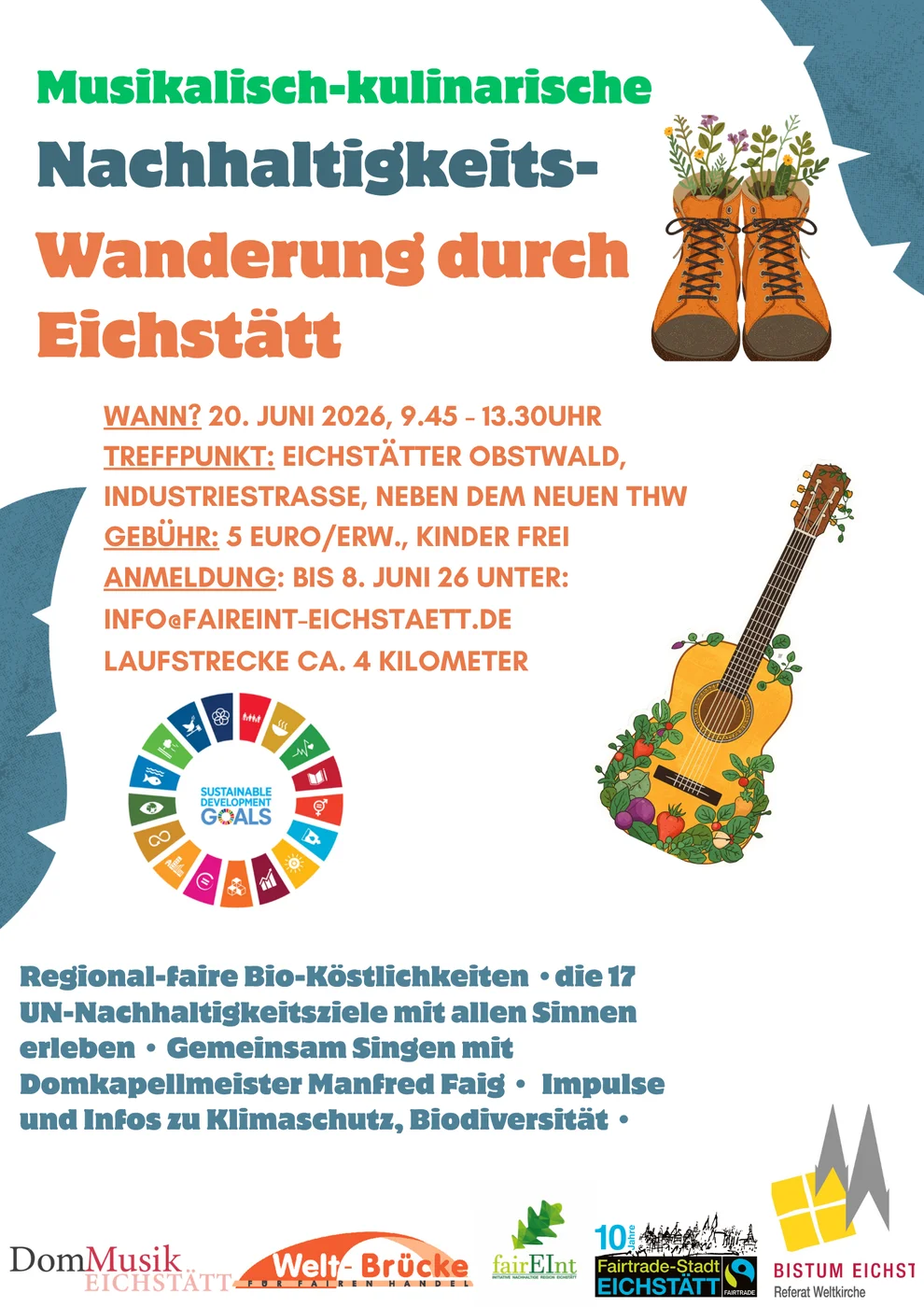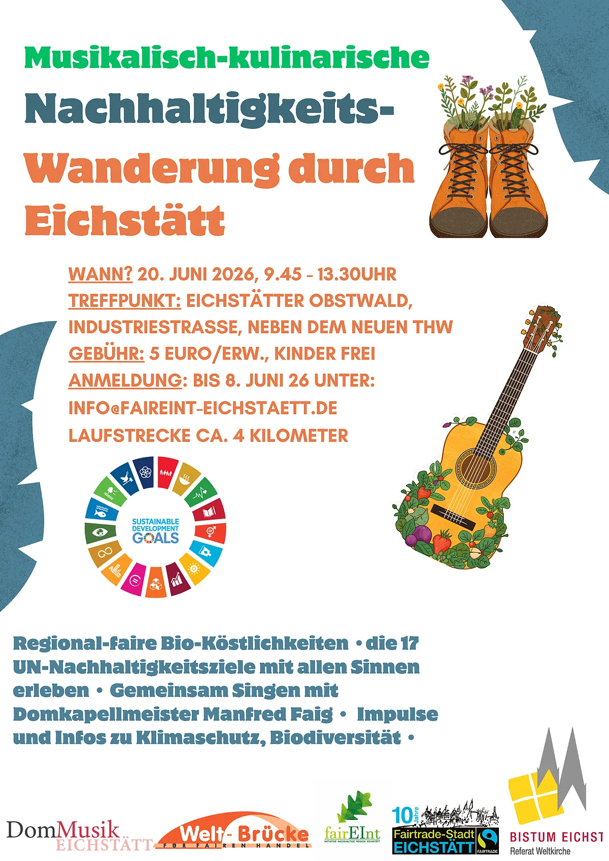 Die Veranstaltung wird organisiert von der Fairtrade-Stadt Eichstätt, dem Welt-Brücke Eichstätt e.V., das Referat Weltkirche des Bistums Eichstätt, die Eichstätter Dommusik, das Nachhaltigkeitsnetzwerk fairEInt und der Fachbereich Klima, Grünplanung, Umweltschutz des Landratsamts Eichstätt.