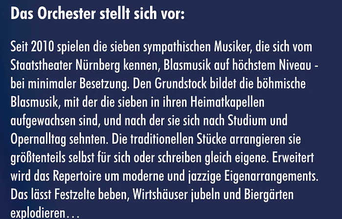 Seit 2010 spielen die sieben sympathischen Musiker, die sich vom Staatstheater Nürnberg kennen, Blasmusik auf höchstem Niveau - bei minimaler Besetzung. Den Grundstock bildet die böhmische Blasmusik, mit der die sieben in ihren Heimatkapellen aufgewachsen sind, und nach der sie sich nach Studium und Opernalltag sehnten. Die traditionellen Stücke arrangieren sie größtenteils selbst für sich oder schreiben gleich eigene. Erweitert wird das Repertoire um moderne und jazzige Eigenarrangements.