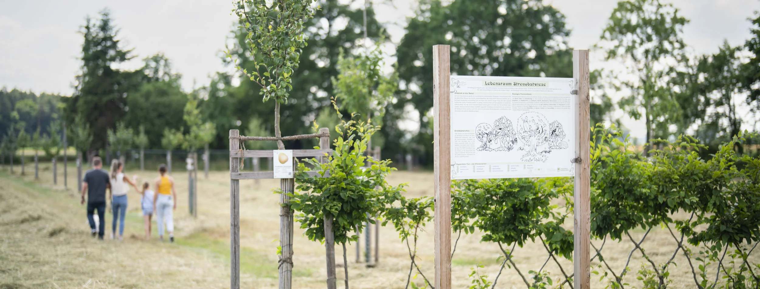 Eine Familie steht an einer Informationstafel im botanischen Obstlehrgarten.