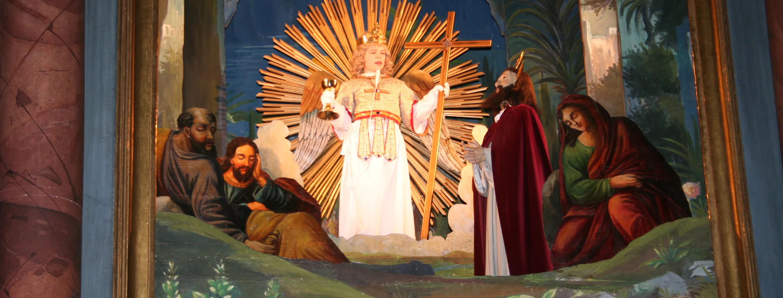 Das heilige Spiel beginnt. Jesus ringt mit der Angst, fleht zu seinem Vater und sinkt zur Erde. Ein Kreuz lässt sich sichtbar auf ihn herab und ruht auf ihm. Schließlich entschwebt es langsam wieder. Ein Christussänger und ein Chor bringen Jesu innersten Gedanken und Erregungen zum Ausdruck. Jesus erhebt sich. Ein Engel kommt vom Himmel, mit Kelch und Kreuz in der Hand, und stärkt und tröstet den Menschensohn. Nach jedem „Fall“ folgt eine passende Schriftlesung. Eine kurze Meditation und ein Fürbittgebet schließen die fromme Andacht ab.
