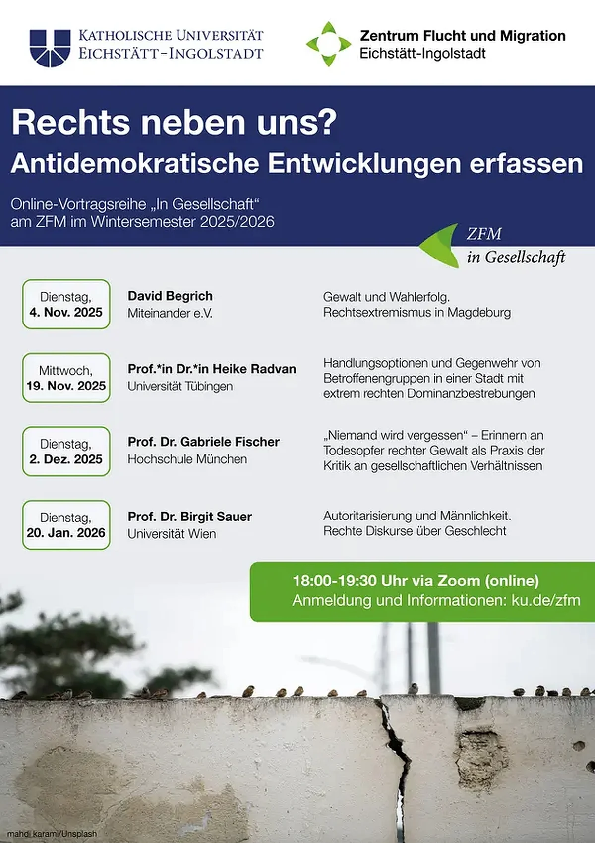 - Termin: 02.12.2025 Referentin: Prof. Dr. Gabriele Fischer (Hochschule München), „Niemand wird vergessen“ – Erinnern an Todesopfer rechter Gewalt als Praxis der Kritik an gesellschaftlichen Verhältnissen.