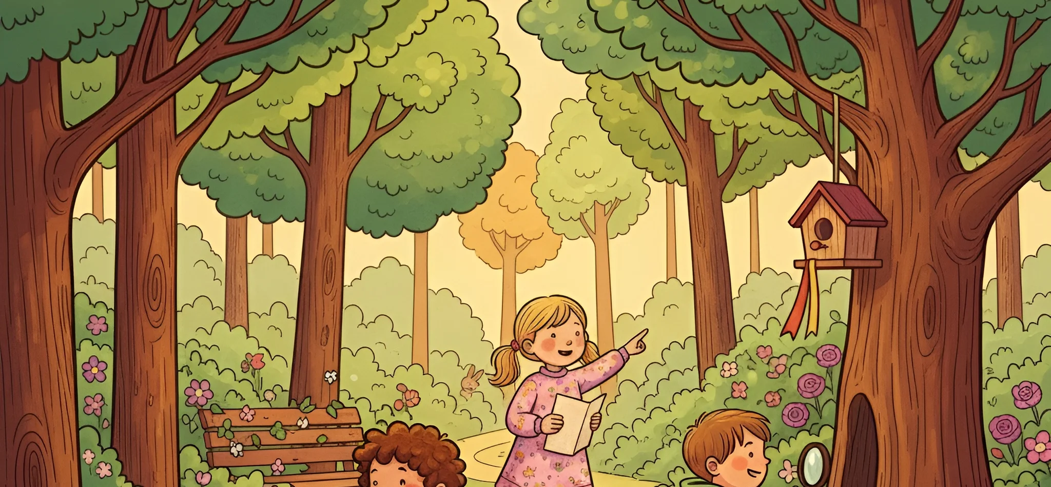 Es werden draußen verschiedenen Hinweisen hinterhergejagt um einen Schatz zu finden.