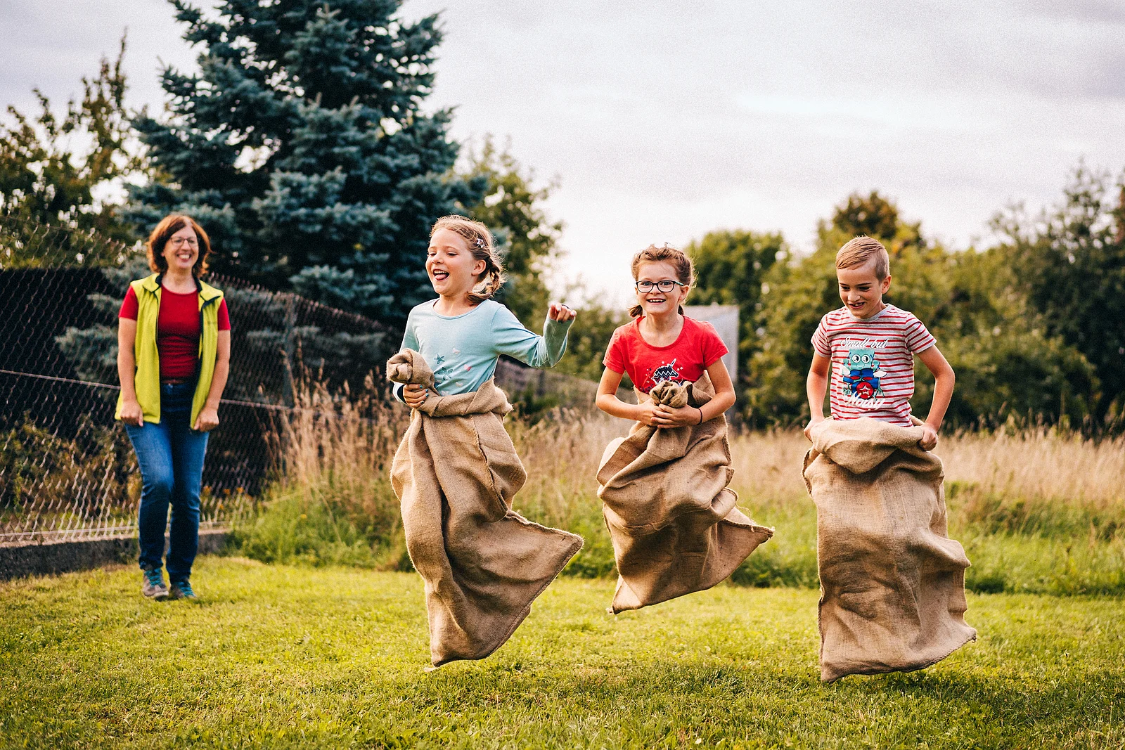 Kinder experimentieren mit WasserDrei Kinder springen in Jutesäcken auf einer Wiese, eine Frau beobachtet sie lachend im Hintergrund.